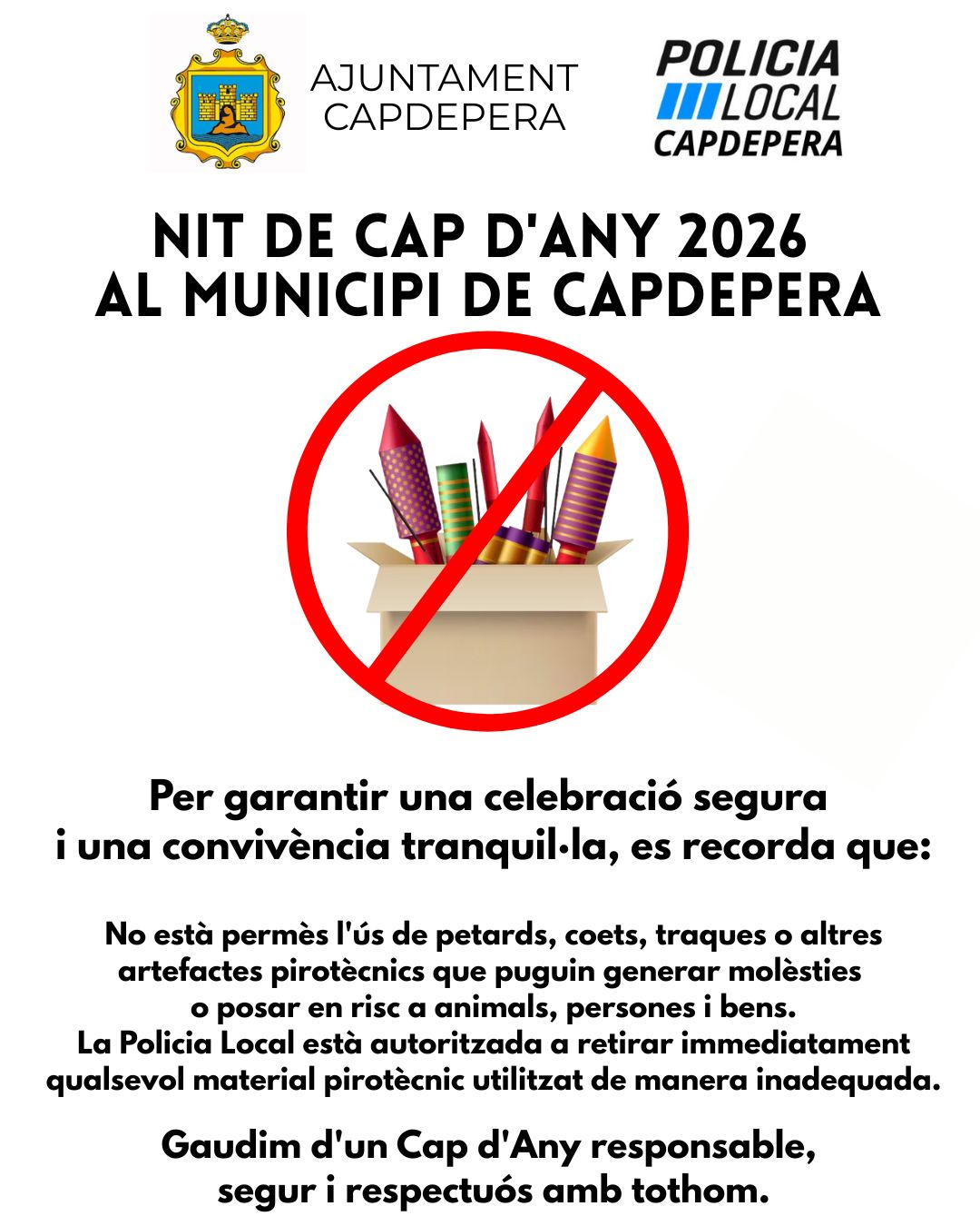 Amb motiu de les celebracions de la Nit de Cap d’Any 2025, i atès que és competència i obligació d’aquesta Batlia assegurar una pacífica convivència i utilització dels carrers i altres espais públics del terme municipal de Capdepera, es fa necessari establir, de conformitat amb la Llei Orgànica 4/2015, de 30 de març, de Protecció de la Seguretat Ciutadana i el Reial Decret 2816/1982, de 27 d’agost, pel qual s’aprova el Reglament General de Policia d’Espectacles Públics i Activitats Recreatives, les següents mesures de seguretat:
