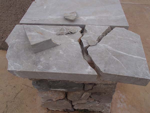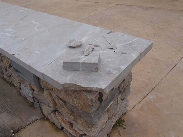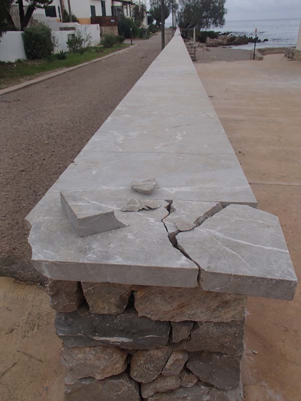 La fiola de pedra que tanca per dalt les parets que delimiten el passeig de les Atzavares ha rebut un fort impacte, l’origen del qual desconeixem, que ha romput la cantonada. Malgrat ser d’un gruix considerable s’ha trencat en distints bocins.