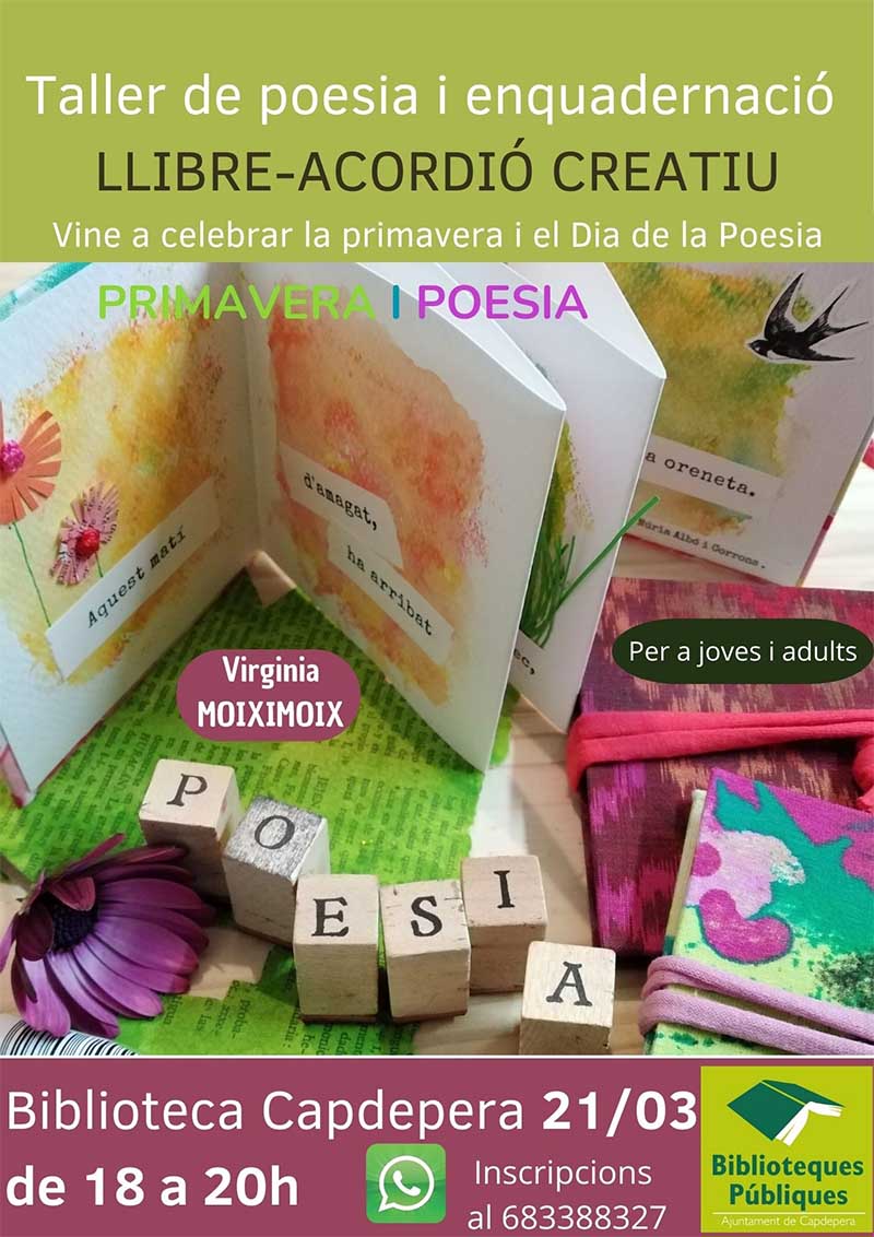 Les nostres biblioteques celebren la vinguda de la primavera i el Dia de la Poesia amb un taller a càrrec de @MoixiMoix, realitzant taller per a confeccionar un llibre-acordió, folrat amb tela i acolorit amb diverses tècniques i materials on recopilar els poemes i versos que més ens agradin.