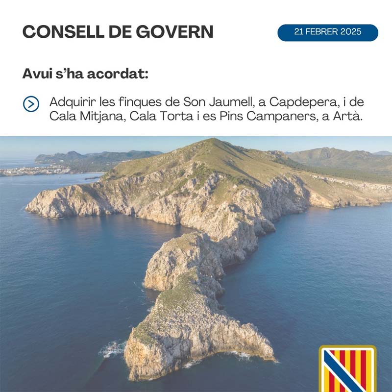 CONSELL DE GOVERN: El Govern comprarà les finques de Son Jaumell (Capdepera) i de Cala Mitjana, Cala Torta i es Pins Campaners (Artà) S’exercirà l’adquisició directa, mitjançant el dret de tempteig. La finca de Son Jaumell (Capdepera) té un total de 490 hectàrees. L’import total màxim de l’operació és de 3,4 milions d’euros.