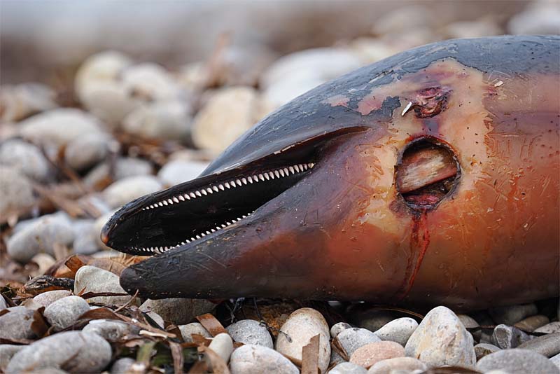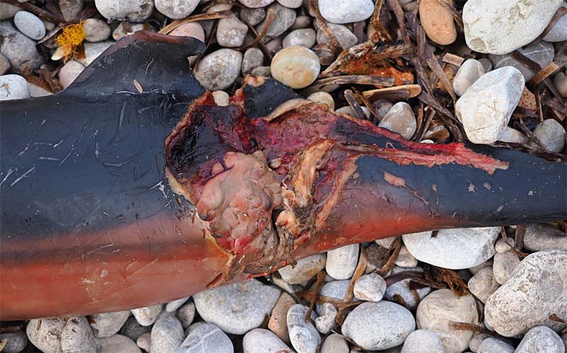 La ferida presentava un espellat cap a la cua amb la pell arrabassada, com si el dofí fes un intent de fugir de l’atac. Per mi, si fos una mossegada posterior a la seva mort, seria un tall net. Però vaja, ni idea, suposo que mai ho sabrem, ni és tant rellevant.