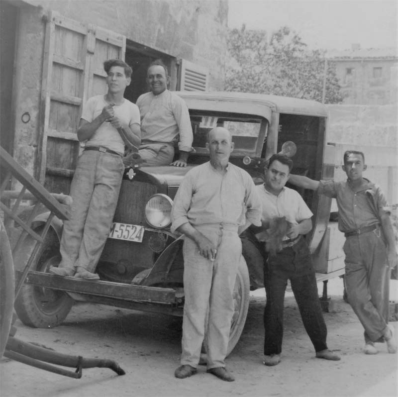 A la tercera foto, el camionet, com se’l coneixia, per repartir el gel i la llenya; a la dreta de la foto en Jeroni Alzina «Jeroniet», al centre mestre Pep Cirera, l’altre desconegut damunt el camionet, a la dreta el pare de mestre Pep Cirera, Francisco Terrassa i a l’esquerra mestre Miquel Massot.