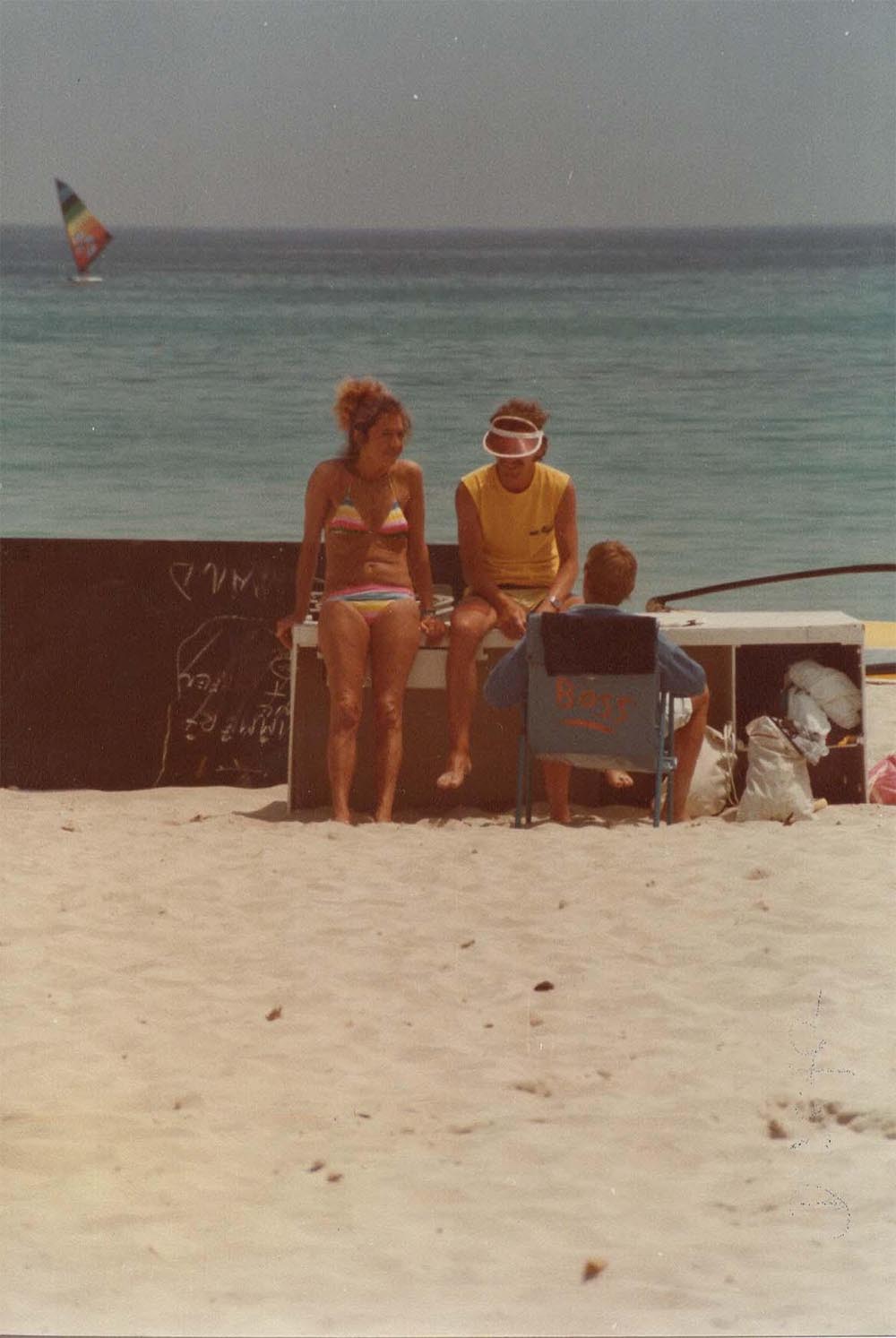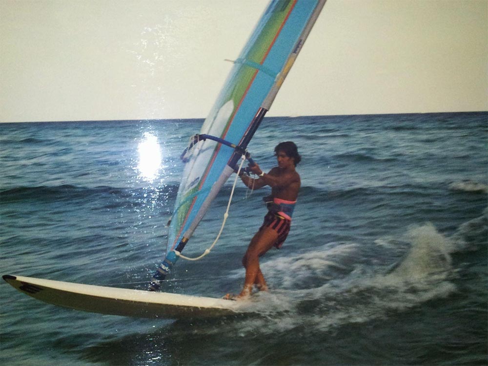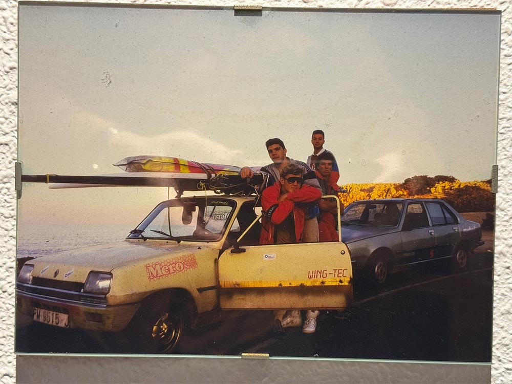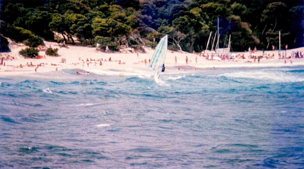 A canvi d’ajudar un poc recollint material de l’escola de windsurf o traient la llanxa -si feia bo, l’embarcació solia dormir damunt la platja-, em deixaven agafar aquells windsurfs tan enormes per sortir a fer l’animal. Així també feia un poc de propaganda d’un esport en hores baixes. Aquells tancs eren tan estables que, si feia poc vent i bona mar, era molt fàcil posar-los de cantell fins i tot marxa enrere. Posava la vela al revés. Ma germana, que tenia deu anys, em pujava damunt les espatlles… O amb en Gabi Oviedo agafàvem el tàndem -un windsurf enorme amb dues veles- i navegàvem cantant cançons de La polla récords: “¡Ayho, ayho, ayho, ayho! Cuando llega fin de mes”.