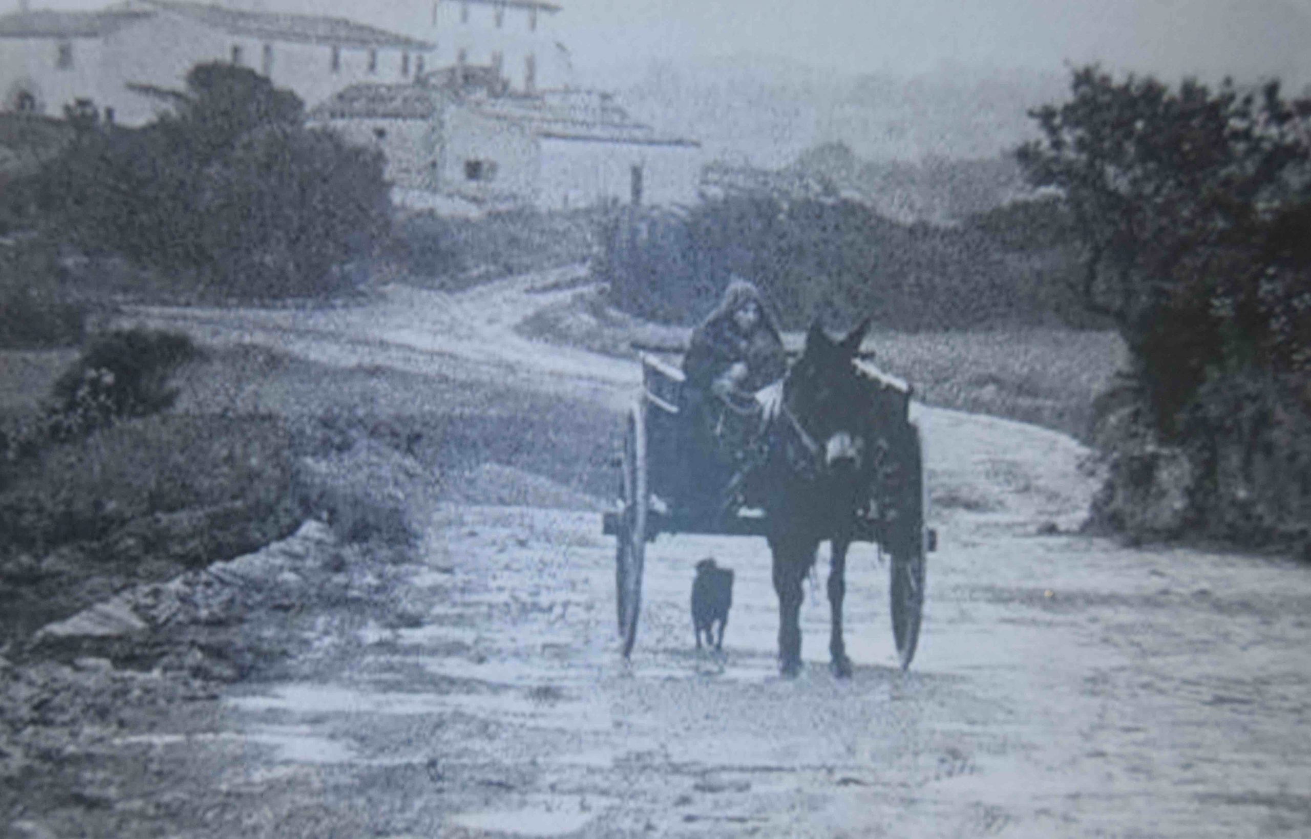 Fotografia històrica d’en Biel Flaquer «Pocapalla» un dia de pluja. En Miquel Verger amb la mula, el carro i el ca, carregat de grosses olles de llet; ell tapat amb una capota anant de Son Jaumell a la finca de Can Mi.