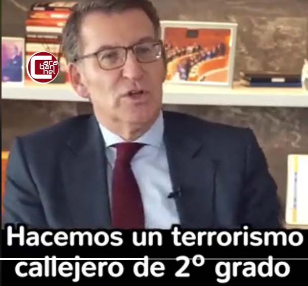 Però el que em fa patir més és Feijóo i Ayuso. Els inductors d’aquesta PP-Borroka de joves nostàlgics tatuats amb esvàstiques i feixiguardapits podrien ser acusats de rebel·lió i terrorisme! I la candidata de Vox que suggeria llençar cóctels molotov a la policia se n’haurà d’anar a Bèlgica? També és ver que el jutge lawferista García Castellón que s’ocupava d’això ara està més ocupat en salvar a Cospedal de la Kitchen o fent callar Fernández Díaz que acusa el seu partit perquè l’han deixat tot sol («Sé fuerte, Jorge!»).
