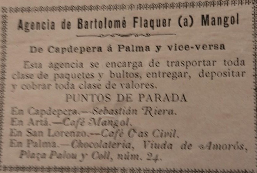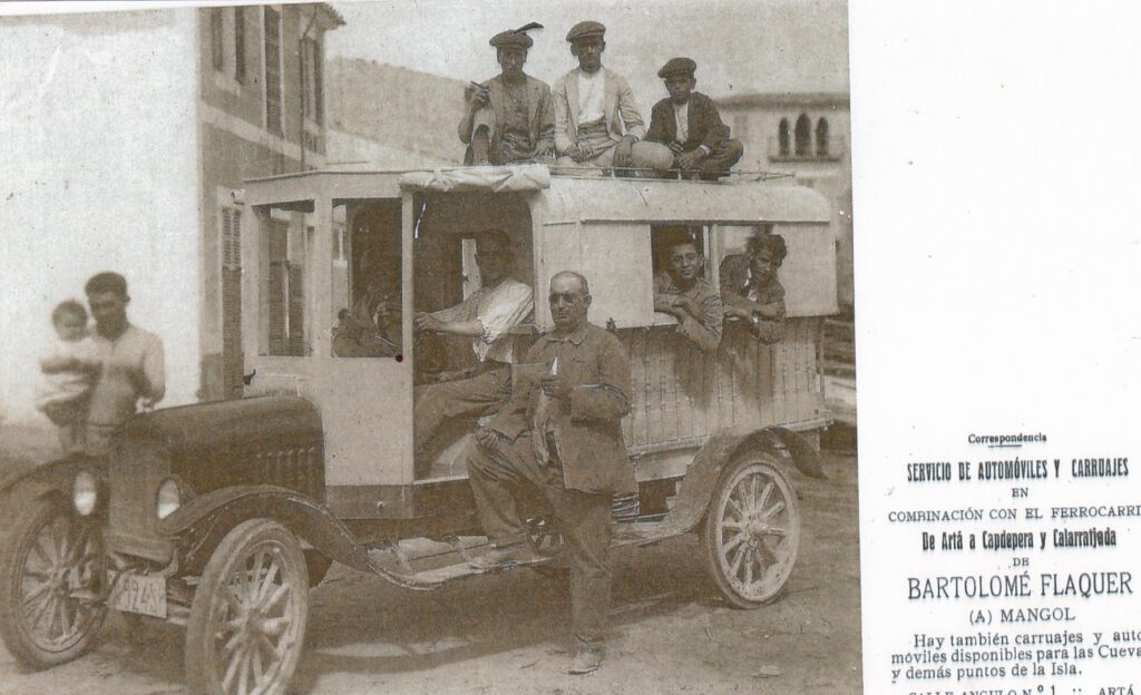 En Bartomeu Flaquer «Mengol, abans tenia una diligència i després adaptaren la carrosseria de la diligència al xassís d’un camió per fer el transbord del tren d’Artà a Capdepera i Cala Rajada. Va esser el primer autobús per fer excursions i portar turistes a les Coves d’Artà. A més, en Bartomeu Flaquer exercia d’agència i feia un servici camió-tren de Capdepera a Palma, que tenia la parada a Capdepera, davant el bar de Can Patilla i a l’altre part del carrer hi vivia en Sebastià Riera.