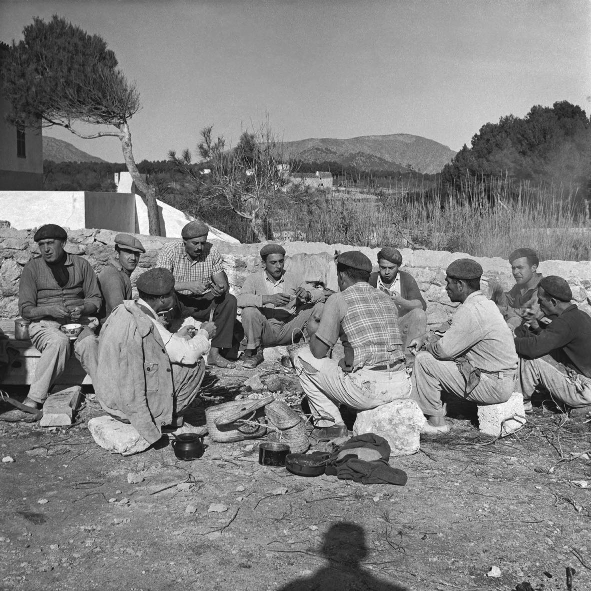 Jetzt habe ich die Gelegenheit, den Namen eines Maurers aus der Anonymität zu holen und diese Gelegenheit möchte ich wahrnehmen. Es handelt sich um Josep Fuster Servera (1922-2009), der, links auf dem Foto, mit einer Baskenmütze auf dem Kopf, in die Kamera von Mr. Canaan schaut. Ebenso wie seine Arbeitskollegen, unter denen sich auch Miquel Sancho Reus und Pere Sancho Mercadal befinden, ist er gerade dabei, sein Mittagessen auszupacken.