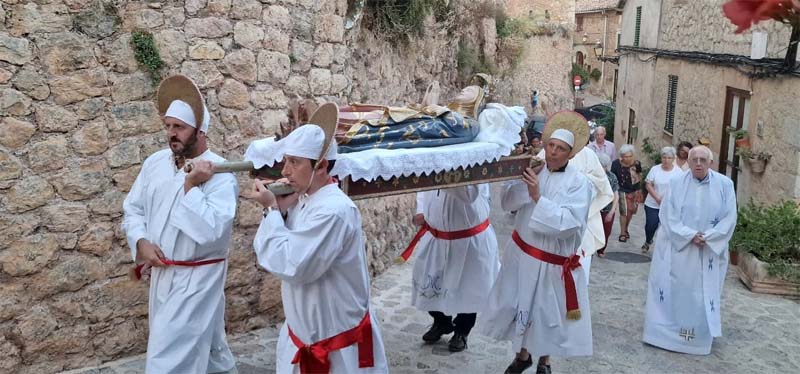 El bisbe Berenguer Batle (1333-1349) elevà la festa de l’Assumpció a la categoria de la festa de Nadal. La processó de l’Assumpta a la Seu de Mallorca començà l’any 1456 per petició del governador del regne Francesc d’Erill i dels jurats de la Ciutat de Mallorques. Aleshores, se’n fixà el cerimonial conservat encara a primeries del segle xvi. Llavors, els canonges de la Seu, vestits d’apòstols, portaven en processó la imatge gòtica de la Mare de Déu Morta que encara es conserva actualment. A principis del segle XVII els cossiers ballaven a Sineu per a la Mare de Déu d’Agost. El 15 d’agost de 1755 encara es documenta la processó de la Mare de Déu a la Seu. Com diu el P. Gabriel Llompart : «una bona part de les esglésies importants celebren processons en les quals els apòstols carreguen amb la imatge de la Mare de Déu morta: la tradició actual de Valldemossa i la tradició escrita de Felanitx de mitjan segle XVIII”. La tradició demana —i els convents de clausura segueixen fidels a la demanda— que la jardineria prepari amb mesos d’antelació testos, grans i menuts, d’alfabeguera que es disposen al voltant del llit de la Mare de Déu»[4].