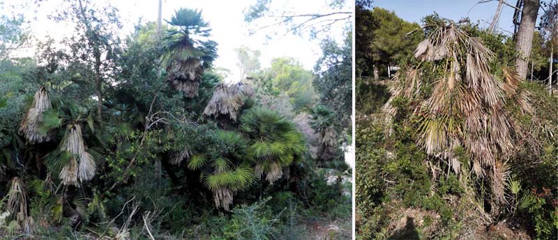 Per desgracia els garballons de la nostra illa han començat a patir l’atac d’un depredador, l’eruga invasora Paysandisia archon que està posant en una difícil situació les zones on aquesta espècie ha crescut durant anys sense cap tipus de problema. Aquesta espècie invasora ha estat introduïda a traves de plantes subtropicals i clar, en no ser d’aquí no compta amb depredadors naturals, fet que propicia la seva expansió. Només hi ha dues solucions per combatre aquesta eruga: la química i la tala dels troncs afectats i com vos mostraré veureu que els garballons de Ca Na Maria ( sa Pedruscada) tampoc se salven d’aquesta plaga, així cal que qualcú prengui nota i se n’ocupi del tractament dels exemplars afectats , abans de que sigui massa tard perquè que hores d’ara ja son molts. No ens podem permetre que la zona de garballons mes grossos i bells del municipi es morin per la inacció de la actual propietat o per la de la institució que pertoqui (Conselleria Medi Ambient-Ajuntament) i encara molt manco que siguin arrasats per les maquines, seria una pèrdua irreparable i imperdonable. Tenim un motiu mes per lluitar perquè aquesta intolerable aberració urbanística no es dugui a terme. Volem urbanisme sense «pelotassos», respectuós amb el medi ambient i l’entorn. Actuar ràpid contra la plaga també és actuar ràpid contra la seva expansió i a favor de la sostenibilitat. Preneu nota i som-hi.