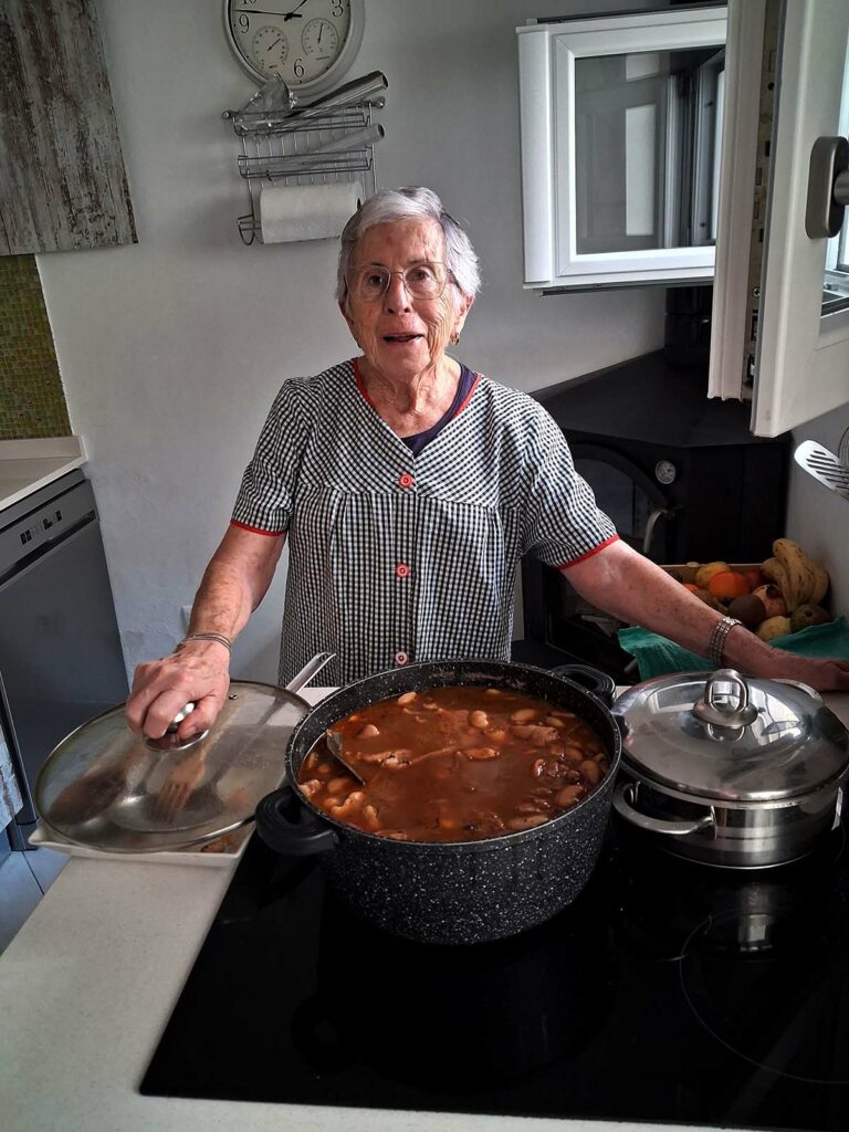 I canvii de casella i me’n torn a ca la germana Maria, amb el germà Pep i les nostres parelles. A dinar, naturalment. Ella, la germana, sempre ha estat molt viatjadora i, per on passa, ha de tastar el menjar de la terra i, si pot, ha de dur material per fer algunes receptes a ca seva. De la darrera eixida, es presentà amb un saquet de judiones de la Granja, una varietat de mongetes blanques, grosses com faves, que inicialment es cultivaven en un redol a prop de la del Real Sitio de San Ildefonso, a la serra del Guadarrama, procedents d’Amèrica. Avui també se’n sembren en altres punts de Castella, però sense l’apel·latiu de la Granja. Segurament, per aquí també se’n poden trobar, de fet a Internet n’hi ha una bona oferta, això sí, més cares que les altres. Però vius, he vist anunciades “alubias granja” que són de la Xina o de Polònia. Les que menjàrem nosaltres, no, aquestes havien arribat directament de Segòvia.