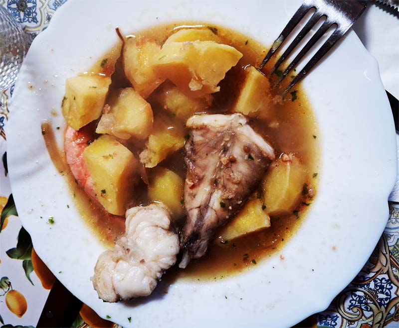 Tota la vida n’he vist fer i n’he fet. Evidentment, i com repetesc sempre, com el de mumare, cap, però jo m’hi mir i, mal m’està dir-ho, però em surt prou bé. Al capdavall, no és més que un aguiat, com tants d’altres, en què la diferència està en l’ingredient principal, és a dir, el rap. Quan era al·lot, el rap es venia mesclat amb la bastina, amb un valor comercial escàs. Avui, en canvi, és una espècie molt apreciada i que no surt gens barata, atenent la grandària del seu cap (amb la qual només podem fer brou) i que, per tant, no se n’aprofita més que una part. De rap en tenim a la Mediterrània i a l’Atlàntic oriental, des de Mauritània a Islàndia. Podríem dir que hi ha dues maneres d’envestir aquesta preparació: fregint prèviament les patates i les tallades del peix, o posant-ho en cruu a la greixonera. Jo, en aquest cas vaig optar per una elaboració mixta, vaig fregir les patates i vaig deixar el rap cruu. Aleshores es tracta, com sempre, de fer un bon sofregit, l’habitual, amb un glop de vi blanc, i tot seguit posar-hi el brou de peix que se suposa que tenim fet (congelat, per exemple); com que tenim les patates fregides, basta afegir-les al final, quan també hi posarem el rap, que en no res serà cuit. I no hi pot faltar una picada generosa feta amb una llesca de pa fregit, una bona grapada d’ametles torrades i all i julivert al gust. Si no vas sobrat de peix, ho pots completar amb gamba (o llagostins), però això ja és encalçar na Maria per sa cuina.