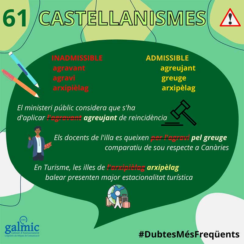 Com ja sabeu, un dels objectius del GALMIC és oferir assessorament lingüístic especialitzat als mitjans de comunicació en llengua catalana, audiovisuals i escrits, de les Illes Balears. És per això que al nostre web publicam unes fitxes lingüístiques amb els dubtes més freqüents. En aquestes fitxes s’explica un tret, a quina varietat geogràfica es troba i de quin registre és propi. Tot això us servirà de recordatori i també per corregir alguna errada que no sabíeu que fèieu. Esperam que us puguin ser útils.