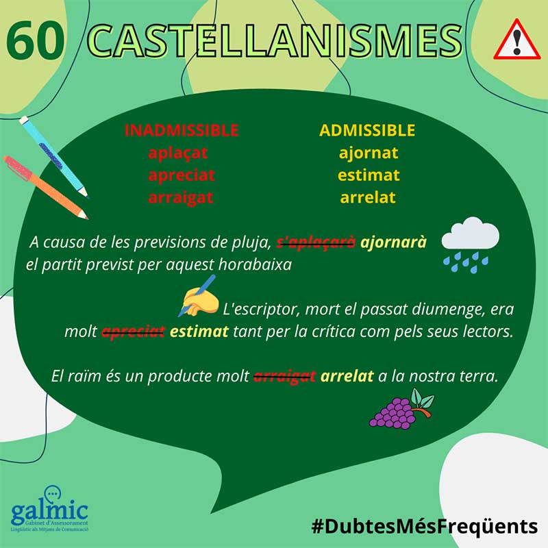 La fitxa doble d’aquesta setmana és sobre alguns castellanismes (amb els seus equivalents adequats en català) que cal evitar sempre que ens sigui possible.
