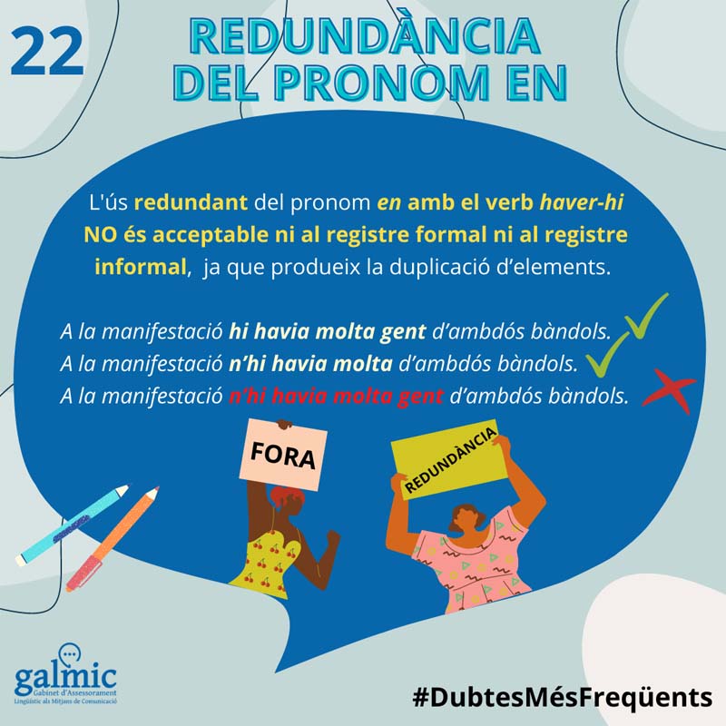 En alguns casos, però, sí que posam pronoms innecessaris, especialment amb al verb haver-hi, que ens ennuvola el pensament i ens sol portar a error. L’ús redundant del pronom en amb el verb haver-hi, la qual cosa dona lloc a la duplicació d’elements, no és acceptable ni en els registres formals ni en els registres informals. Per això, podem dir tant Al partit hi havia molts seguidors d’ambdós equips com Al partit n’hi havia molts d’ambdós equips, però no *Al partit n’hi havia molts seguidors d’ambdós equips.