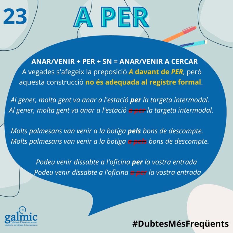 Amb el significat de ‘anar o venir a cercar’ solem emprar els verbs anar i venir seguits de la preposició per en el cas dels registres formals i a per en els registres informals. Per això, mentre que en un diari hi podem trobar oracions com Al mes de gener, molta gent va anar a l’estació per la targeta intermodal, Podeu venir a l’oficina per la vostra entrada a partir de dissabte o La major part dels clients van venir a la botiga pels bons de descompte, si parléssim d’aquests temes amb els amics diríem Vaig anar a l’estació a per la targeta, Podeu anar a l’oficina a per l’entrada a partir de dissabte o Molta gent va venir a la meva botiga a pels bons de descompte. Ambdues construccions són normatives, però en contextos diferents.