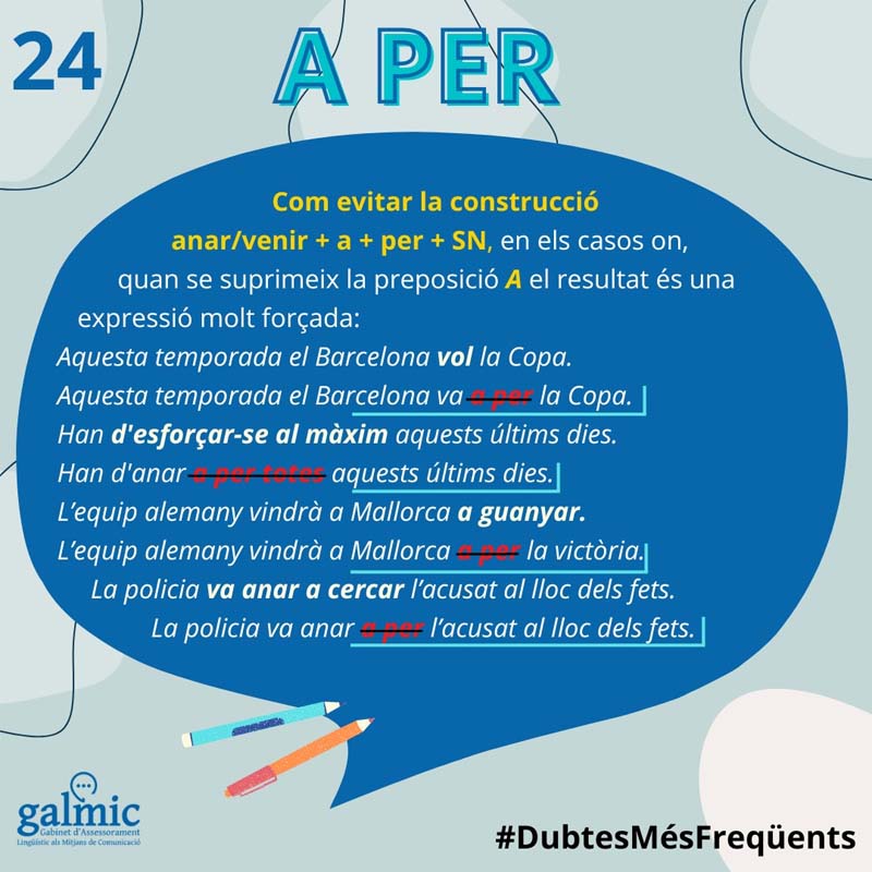 Posem per exemple el context de la locució d’un partit entre el Barcelona i el Madrid. No direm Aquesta temporada el Barcelona *va a per la Copa, sinó que vol la Copa. Tampoc direm Si volen guanyar el partit, *hauran d’anar a per totes, sinó que s’hauran d’esforçar al màxim. L’equip blaugrana no ve *a per la victòria, sinó a guanyar, i un cop ho hagi fet, no direm coses com *A pel vint vint-i-setè títol! ni *I ara, a per la Champions!, sinó Cap al vint-i-setè títol o I ara, la Champions!