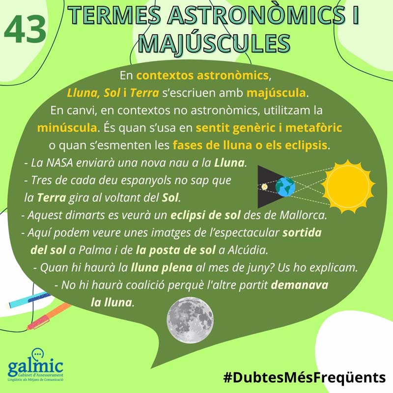 Seran comptades les vegades que tindrem ocasió de parlar de tots aquests conceptes, però els dubtes ens envolten, de nou, literalment. Com ens hem de referir al Sol i a la Lluna? I al nostre planeta? Depèn. Si en parlam en un context astronòmic, és a dir, quan ens referim al planeta, al satèl·lit concret que orbita la Terra i a l’astre concret que ens il·lumina, ho farem amb majúscula. Per exemple si comentam el misteri de per què fa tants anys que no anam a la Lluna o el fet que tres de cada deu espanyols no sap que la Terra gira al voltant del Sol.