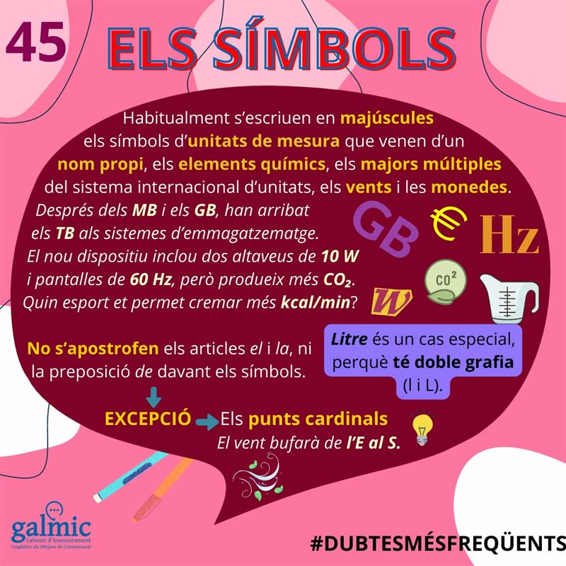 El drama comença a l’hora de pensar si els símbols s’escriuen en majúscula o minúscula, ja que aquí hi ha molta alternança. De totes maners, en general, s’escriuen en majúscules els símbols d’unitats de mesura que provenen d’un nom propi, els elements químics, els múltiples més grans del sistema internacional d’unitats, els vents i les diferents monedes: els MB, els GB, els TB, altaveus de 10 W, pantalles de 60 Hz, el CO₂ o les kcal. Només litre és un cas especial, perquè té doble grafia (l i L).