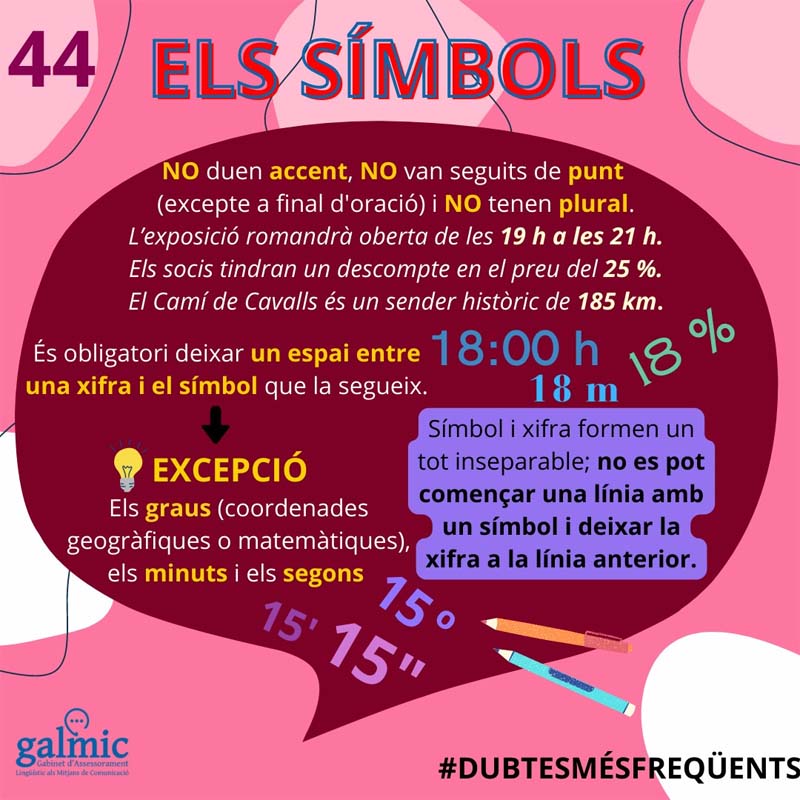 Per altra banda, quan els símbols acompanyen una xifra, hi ha d’haver un espai entre ambdós. Per això escrivim 18 €, 18:00 h, 18 %, 18 m o 18 °C. L’única excepció són els graus (coordenades geogràfiques o matemàtiques), els minuts i els segons (15º, 30′ o 15″), els quals s’escriuen aferrats a la xifra. En general el símbol i la xifra que el precedeix formen un tot inseparable (hi hagi un espai o no), per tant, en cap cas no s’ha de començar línia amb un símbol deixant la xifra a la línia anterior.