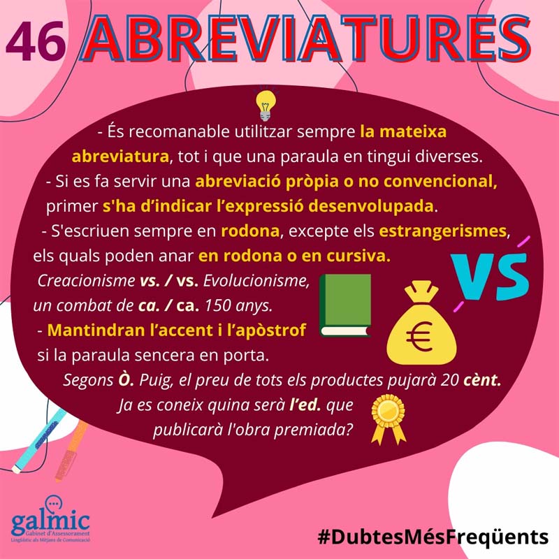Fa unes setmanes vam parlar dels símbols; ara és el torn de les abreviatures, reduccions de paraules mitjançant la representació de només algunes de les lletres que les conformen. A l’hora d’escriure, és habitual l’ús d’abreviatures per estalviar espai, sobretot quan hem de repetir molt una denominació llarga, però cal anar amb compte i no abusar-ne o dificultaran la comprensió i la claredat del text (no volem tornar a l’època del llenguatge SMS!).