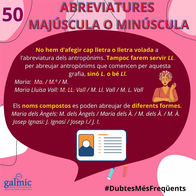 Els antropònims, noms propis de persona, també solen abreviar-se, especialment si hi afegim els cognoms i els repetim molt. Alerta amb alguns casos especialment problemàtics. Com diríeu que s’escurça Maria: Ma. o M.ª? Idò de cap de les dues maneres, simplement M. En català no hem d’afegir cap lletra ni cap lletra volada a l’abreviatura dels antropònims. I en el cas de Lluïsa, diríeu que és LL., L. o Ll.? Aquí, tant la segona com la tercera són bones, ja que els antropònims que comencen per la grafia ll s’abreugen com a L. o Ll.
