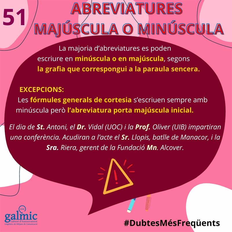 Cal ser sempre acurats amb la llengua, però encara més en els registres formals. Al darrer article que vam publicar us vam dir que l’ús de majúscula o minúscula en les abreviatures depèn de com s’escrigui la paraula desenvolupada, però sempre hi ha alguna excepció: les fórmules generals de cortesia s’escriuen amb minúscula inicial, però l’abreviatura, amb majúscula inicial. Si en algun moment heu d’escriure una queixa a la presidenta de les Illes Balears, haureu d’adreçar-vos a la Molt Honorable Senyora (o M. Hble. Sra.) Margalida Prohens. Si trobau que no cal recórrer a tan altes instàncies, us podeu adreçar al batle de Palma, a l’Excel·lentíssim Senyor (o Excm. Sr.) Jaume Martínez. Podeu argumentar que us avalen el doctor (o Dr.) Seny, la doctora (o Dra.) Raó i el professor (o Prof.) Sentit Comú. I encomanar-vos a sant (o St.) Antoni perquè us escoltin i no només us sentin!