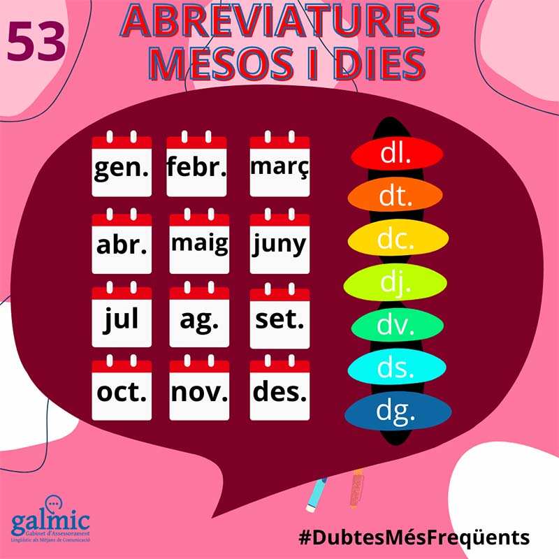 Pel que fa als mesos de l’any, les formes més habituals són gen., febr., març, abr., maig, juny, jul., ag., set., oct., nov. i des. Fixau-vos que alguns mesos tenen noms tan curts que no s’escurcen!