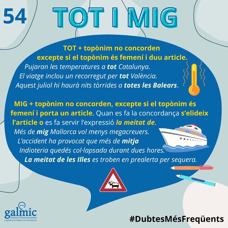 Tot no és l’únic adjectiu que crea dubtes davant un topònim: passa el mateix amb mig. Aquest és invariable, davant d’un topònim, excepte si és femení i porta un article. En aquest cas, es fa la concordança i s’elideix l’article o, si no és possible elidir-lo, es fa servir l’expressió la meitat de: La meitat de les Illes es troben en prealerta per sequera, Més de mig Mallorca vol que disminueixi la presència de megacreuers, Les pluges han provocat que més de mitja Serra de Tramuntana quedi incomunicada, Les pluges han provocat que més de la meitat de la Serra quedi incomunicada, Avís taronja per fort vent a la meitat de la Península, Avís taronja per fort vent a mitja península Ibèrica.