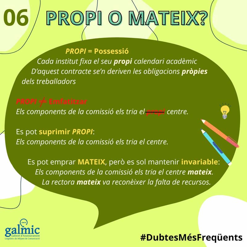 A tots ens agrada exagerar una mica i fer notar les nostres idees; no ho podem evitar. Per sort, la llengua evoluciona en consonància amb els nostres propis desitjos i ja podeu comptar que hi ha una alternativa normativa. La forma mateix (però només aquesta, deixeu de banda els seus derivats) és perfectament vàlida per fer èmfasi en allò que vulguem, sempre que la posem posposada. Així tenim que es pot dir El director mateix va dir de plegar més prest, La Marta mateix m’ho ha explicat tot o Segons els metges mateix, no hi ha res a fer pel meu germà. Anau alerta, perquè no és el mateix que et donin carbasses una vegada (La noia mateix em va rebutjar) que si ho fan un parell de pics (La mateixa noia em va rebutjar)!