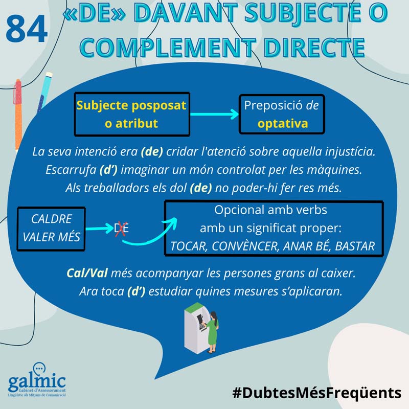 A l’article anterior vam parlar sobre l’alternança de preposicions davant d’infinitiu amb verbs de règim verbal, és a dir, que exigeixen una preposició (parlar de, accedir a, consistir a, conformar-se a…). Avui parlarem de tres funcions sintàctiques (subjecte, atribut i complement directe) que, tot i no emprar habitualment una preposició, si porten una subordinada d’infinitiu, poden dur la preposició de. Davant un subjecte o un atribut corrents no se’ns acudiria mai posar una preposició, però si és una subordinada d’infinitiu que posam després del verb i no abans, cosa que feim sovint quan parlam, la preposició de és optativa. Per exemple: La seva intenció era (de) quedar-s’ho tot, Escarrufa (de) veure imatges com aquesta o Em dol (de) no poder-hi fer res més. Com sempre hi ha d’haver excepcions, amb funció de subjecte, la preposició de no apareix amb verbs de necessitat com caldre o la construcció valer més: Cal/Val més acompanyar les persones grans quan vagin al caixer.