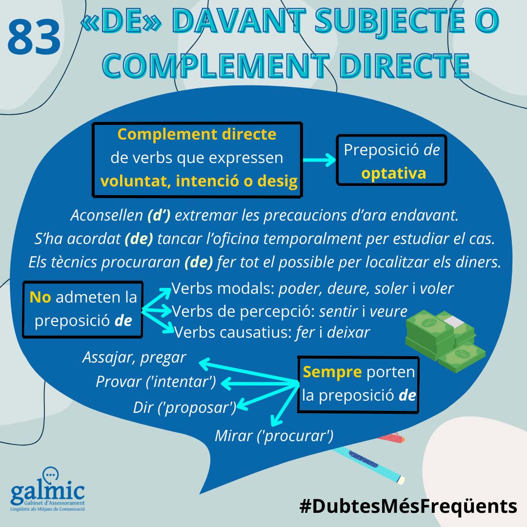 Ja per acabar, us volem advertir que els verbs poder, deure, soler i voler, els verbs de percepció sentir i veure, així com els verbs causatius fer i deixar, no admeten la preposició de davant d’un infinitiu que fa de complement directe. En canvi, verbs com assajar, dir (amb el significat de proposar), mirar (amb el significat de procurar), pregar o provar (amb el significat d’intentar) sempre porten la preposició de. Fixau-vos-hi: Els meus amics volen organitzar una festa, però Els meus amics han dit d’organitzar una festa, Els meus amics miraran d’organitzar una festa i Els meus amics provaran d’organitzar una festa.