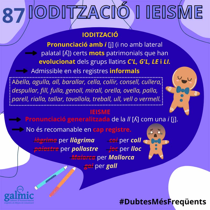 Per tant, mentre que del ieisme n’heu de fugir com si fos el dimoni, la iodització la podeu fer servir tant com vulgueu, excepte en registres formals. I com podem saber quan és ieisme i quan iodització? Bé, una cosa que podeu fer és apuntar-vos a un curs de llatí inicial a l’estiu. A banda d’això i memoritzar les paraules que poden tenir iodització, només us podem donar dos consells. Un és que a principi de paraula no hi haurà mai iodització. L’altre és que, en cas de dubte, pronuncieu sempre la LL. La lliçó d’avui pot semblar una minúcia i més si tenim en compte que les llegües es troben en constant procés de canvi i transformació. El cas és que la fonètica d’una llengua és una part ben important de la seva identitat. Si deixam que, una a una, les característiques que ens defineixen es perdin, què ens quedarà?