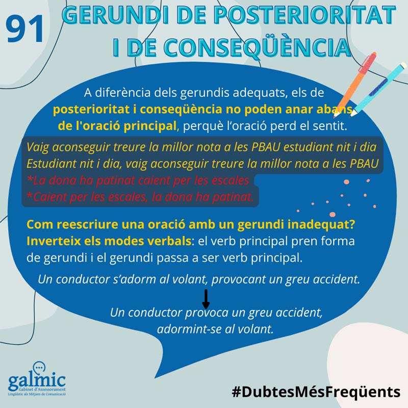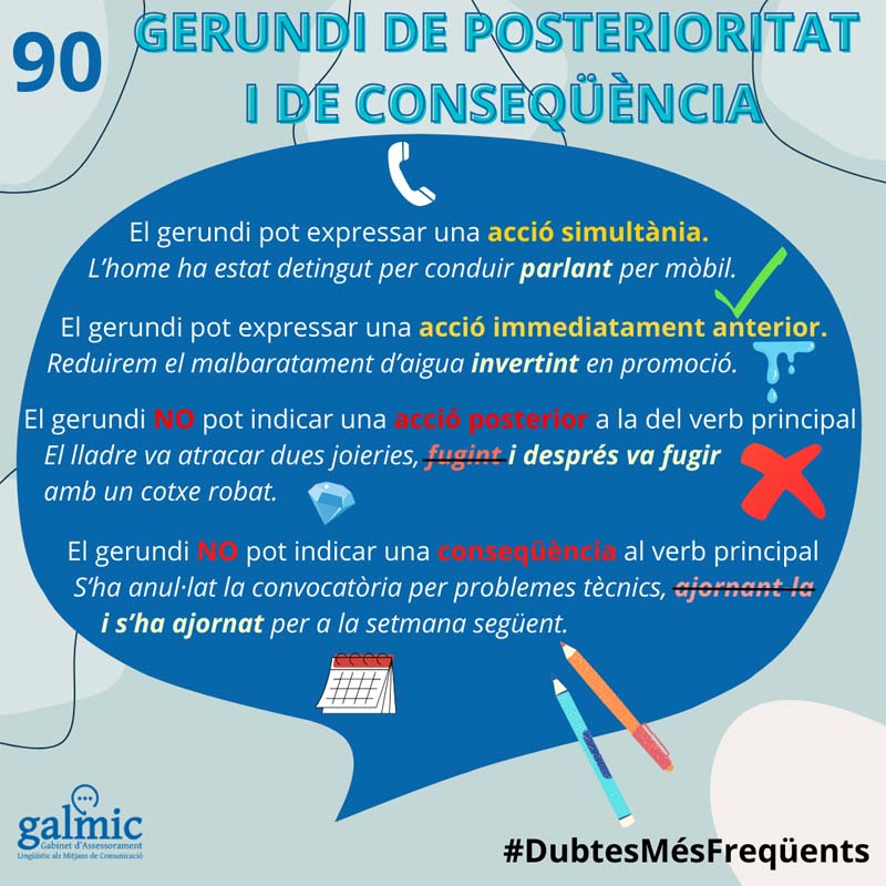 El gerundi és una forma verbal que pot expressar tant una acció simultània com una d’immediatament anterior a la de l’oració principal per indicar com es realitza l’acció del verb del qual depèn. Per exemple, si deim M’han aturat per conduir parlant per mòbil, el gerundi és adequat perquè és una acció simultània: parlava per mòbil mentre conduïa. També és adequat dir Treballant i estalviant durant 30 anys, un jove es podrà permetre una hipoteca, perquè treballar i estalviar són accions immediatament anteriors a demanar una hipoteca.