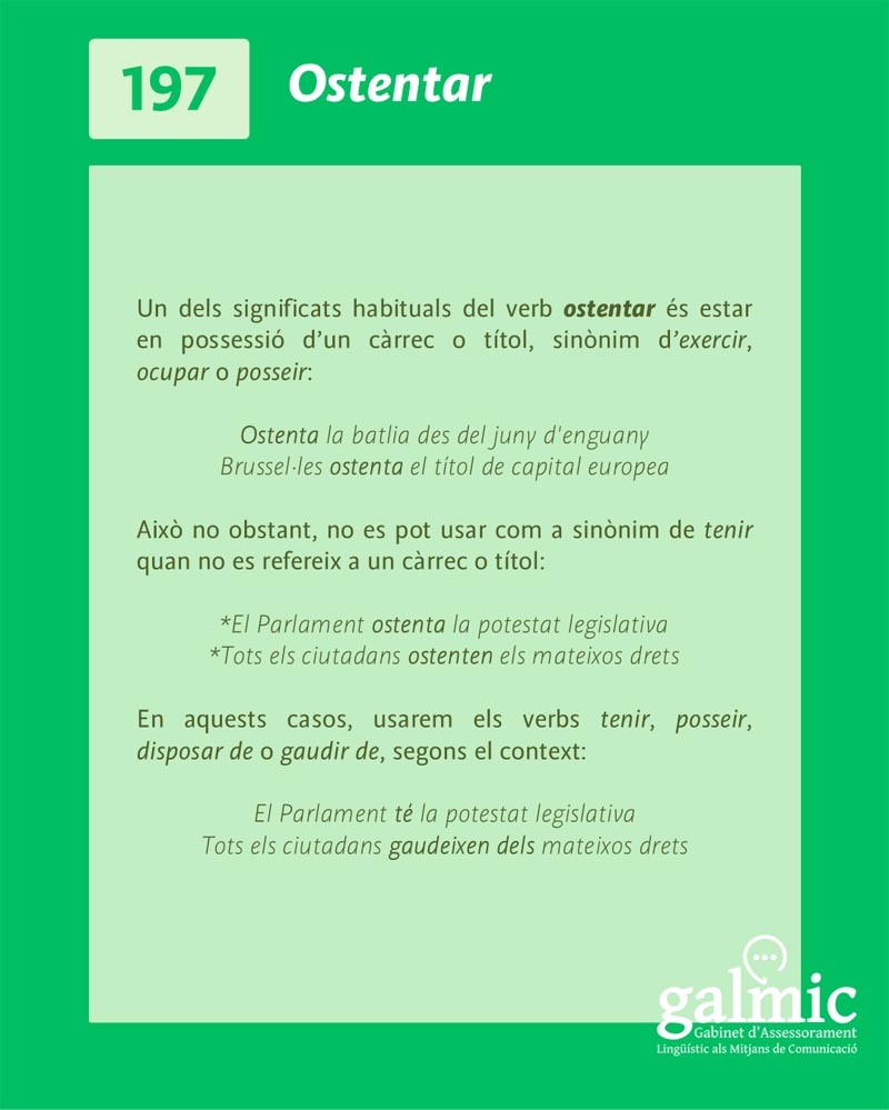 Ara bé, un ús que no és propi de la llengua catalana i, per tant, no és recollit per la normativa, és l’ús del verb ostentar com a sinònim de tenir quan no es fa referència a un càrrec, una posició o un títol. Així, en aquests casos hem de recórrer a verbs com tenir, posseir, disposar de o gaudir de segons el context. Són usos inadequats afirmar que *El parlament ostenta la potestat legislativa, *Tots els ciutadans ostenten els mateixos drets o, per seguir amb el fil, *La marquesa ostenta les facultats per decidir. En aquests casos el verb ostentar no pot significar res més que demostrar o mostrar i, com hem indicat, cal recórrer a uns altres verbs: El parlament té la potestat legislativa, Tots els ciutadans gaudeixen dels mateixos drets o La marquesa disposa de les facultats per decidir.