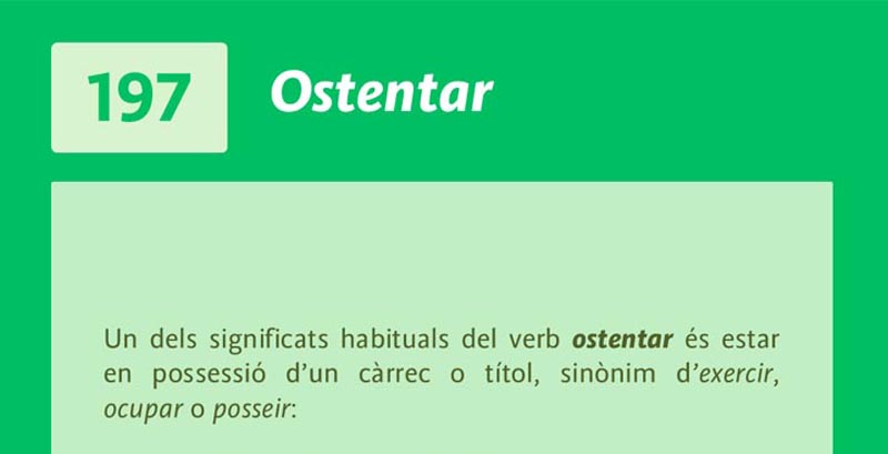 El verb ostentar pot significar mostrar o demostrar, com quan ens referim a l’ostentació que una persona fa de qualque cosa: La marquesa ostenta les seves riqueses sempre que pot, però també pot voler dir estar en possessió d’un càrrec i, per tant, ser sinònim de tenir. En aquests casos, podem dir que Vance ostenta la vicepresidència dels Estats Units d’Amèrica, que Galmés ostenta la presidència del Consell de Mallorca o que Brussel·les ostenta el títol de capital europea. Amb aquest significat el verb ostentar sempre fa referència a una posició, un càrrec o un títol. Retornat a la nostra marquesa ostentosa podríem formular una oració com La marquesa ostenta el títol d’ençà de la mort del seu pare.