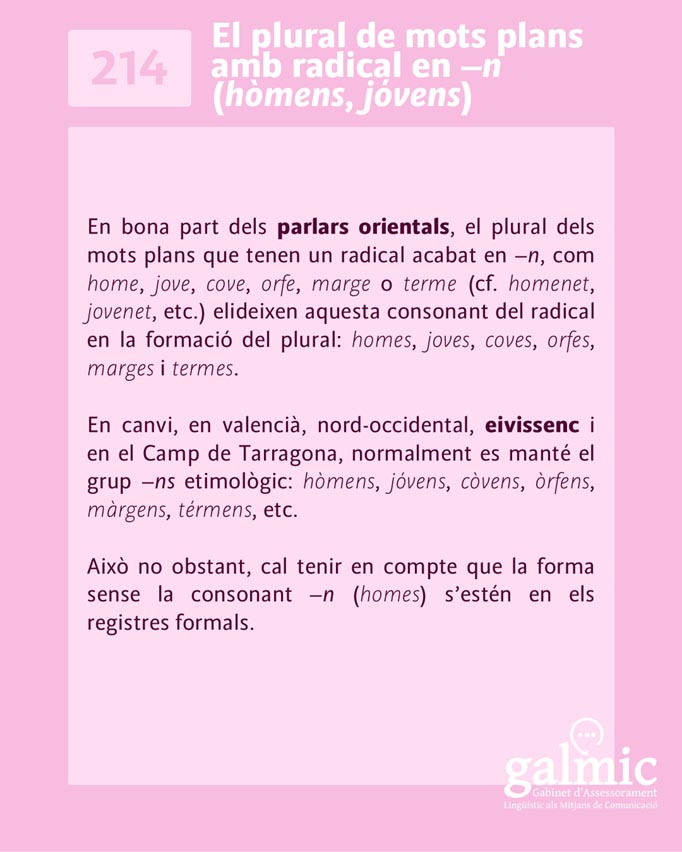 Les varietats dialectals del català que parlam a les Illes Balears són riques i diverses. Mentre que els menorquins i els mallorquins feim el plural dels mots plans amb radical en –n com jove o home sense aquesta n: joves, homes, els nostres veïnats eivissencs afegeixen una –n en les formes de plural, i diuen: jóvens i hòmens. Aquesta consonant afegida no prové del no-res, sinó que forma part de l’arrel de la paraula. Pensem que paraules com jove i home recuperen aquesta n en fer diminutius o augmentatius: jovenet, homenàs, etc. Així, doncs, som nosaltres, mallorquins i menorquins, que hem perdut aquesta n del plural pel camí. Però aquest fenomen no és endèmic de les Balears, sinó que es dona arreu del territori de parla catalana. Mentre que la majoria dels dialectes del bloc oriental perden aquesta n del radical en formal el plural, els parlars valencians, nord-occidentals, eivissencs i del Camp de Tarragona, la mantenen. Alguns dels mots que es veuen afectats per aquest manteniment són, els ja indicats, jóvens, hòmens, i també d’altres com còvens (cove), òrfens (orfe), màrgens (marge), térmens (terme), imàtgens (imatge) o, com recull el titular d’aquest article, àsens (ase), entre altres casos. De fet, al municipi de Bunyola trobam el nom de la possessió de Son Térmens, un vestigi de quan aquesta forma de plural era la dominant, abans que perdéssim la n pel camí. En definitiva, ambdues formes del plural conviuen avui dia distribuïdes per la catalanofonia. No obstant això, en registres formals s’estén la forma sense n (homes, joves, etc.). Ara ja ho sabeu, però si encara teniu algun dubte, recordau que podeu posar-vos en contacte amb el GALMIC a través de WhatsApp, Telegram o correu electrònic, en trobareu tota la informació al nostre web (www.galmic.uib.cat).