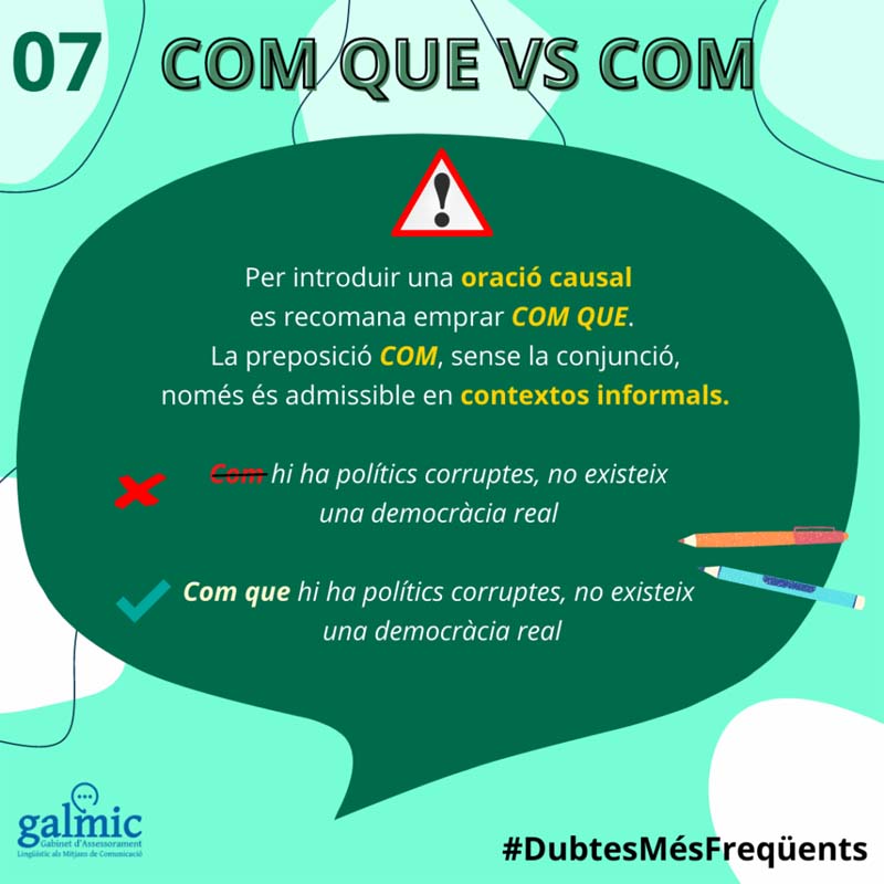 A diferència dels apunts que hem fet altres vegades, la qüestió lingüística que tractam avui no és completament inadmissible. En l’àmbit informal s’usa amb freqüència només com a les oracions causals, però no és recomanable a l’àmbit formal. Així que preneu-ne nota per quan hagueu de demanar una pujada de sou al vostre cap (Com que només arrib tard dos dies de cada tres, meresc un sou més elevat), quan hagueu de demanar a la guàrdia civil que no us posin una multa (Com que parlava per telèfon, no he vist el semàfor en vermell) o en el cas d’haver de presentar una reclamació a l’Ajuntament (Com que ja vaig pagar els meus imposts l’any passat, sol·licit no pagar-los enguany).