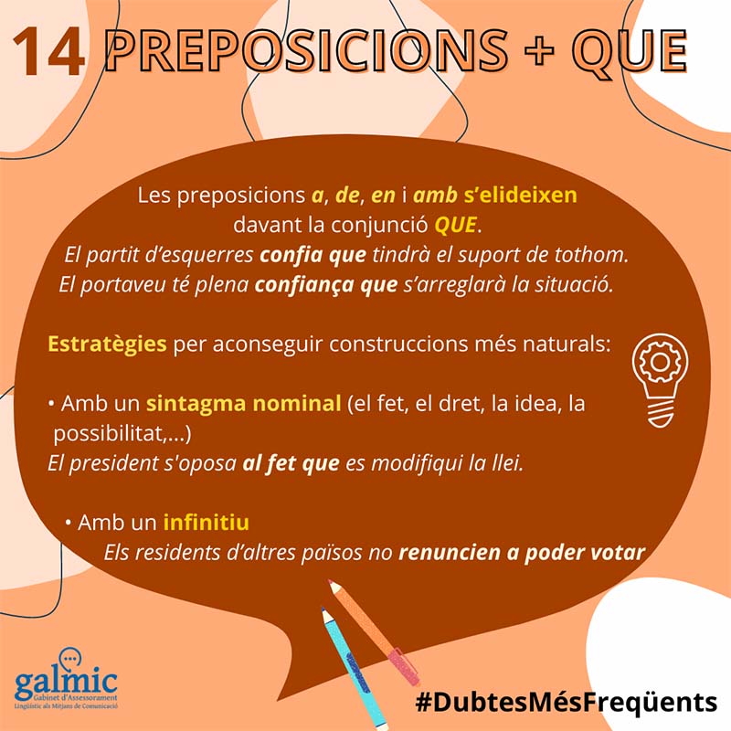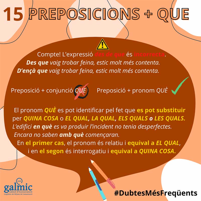 Un darrer apunt. Recordau que tampoc és adequat emprar des de que, tot i que alguns el tinguin molt interioritzat. En aquests casos es pot emprar des que o d’ençà que. Esperam que des que i d’ençà que us donam consells de gramàtica i d’ortografia, domineu més la llengua!