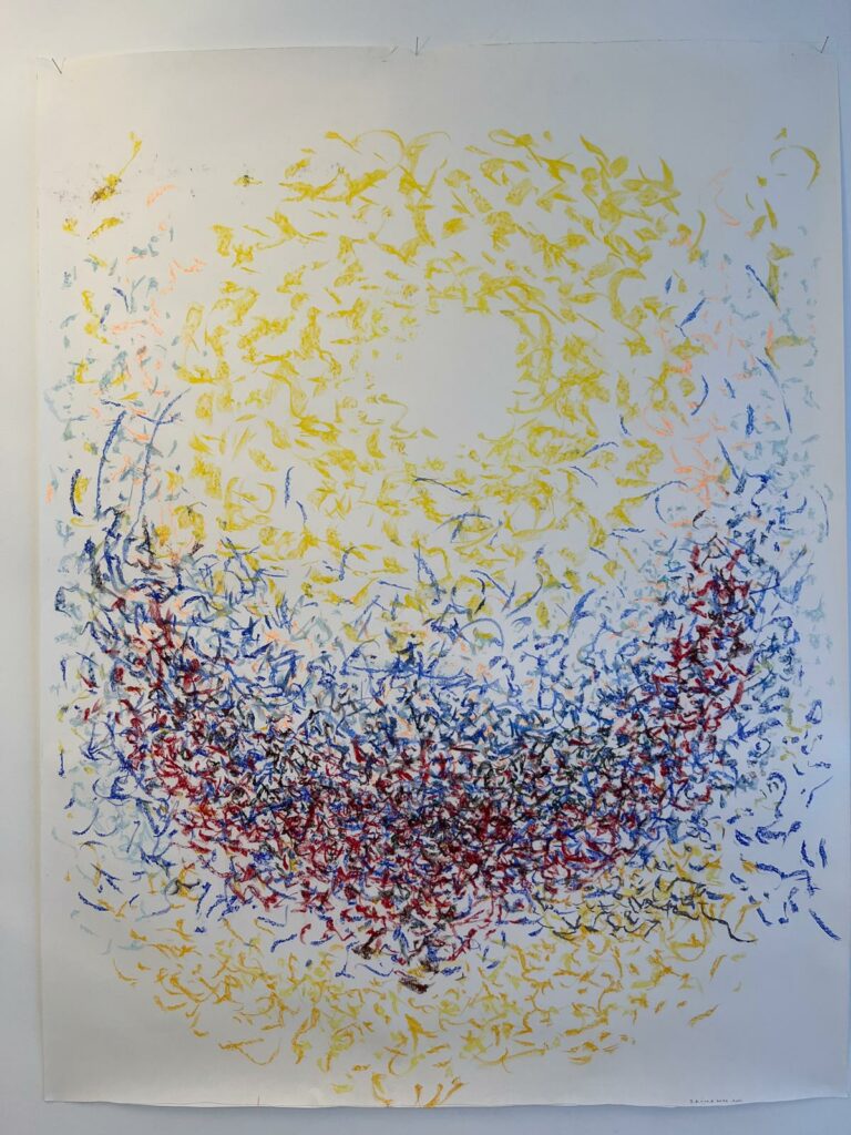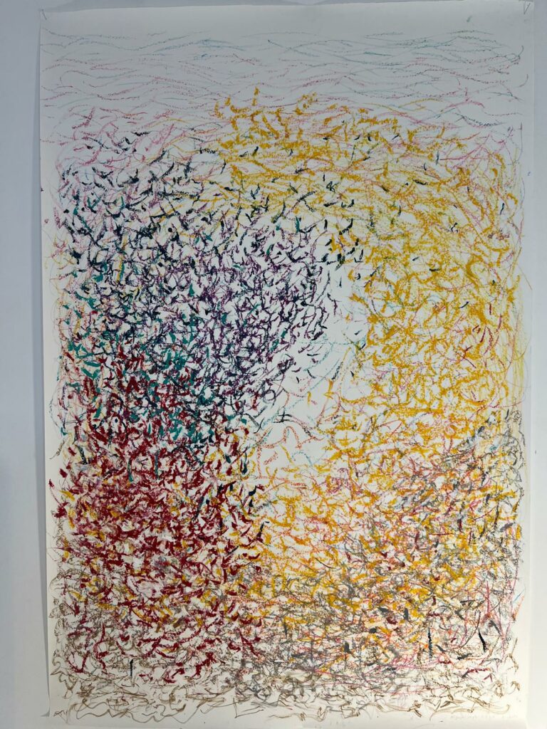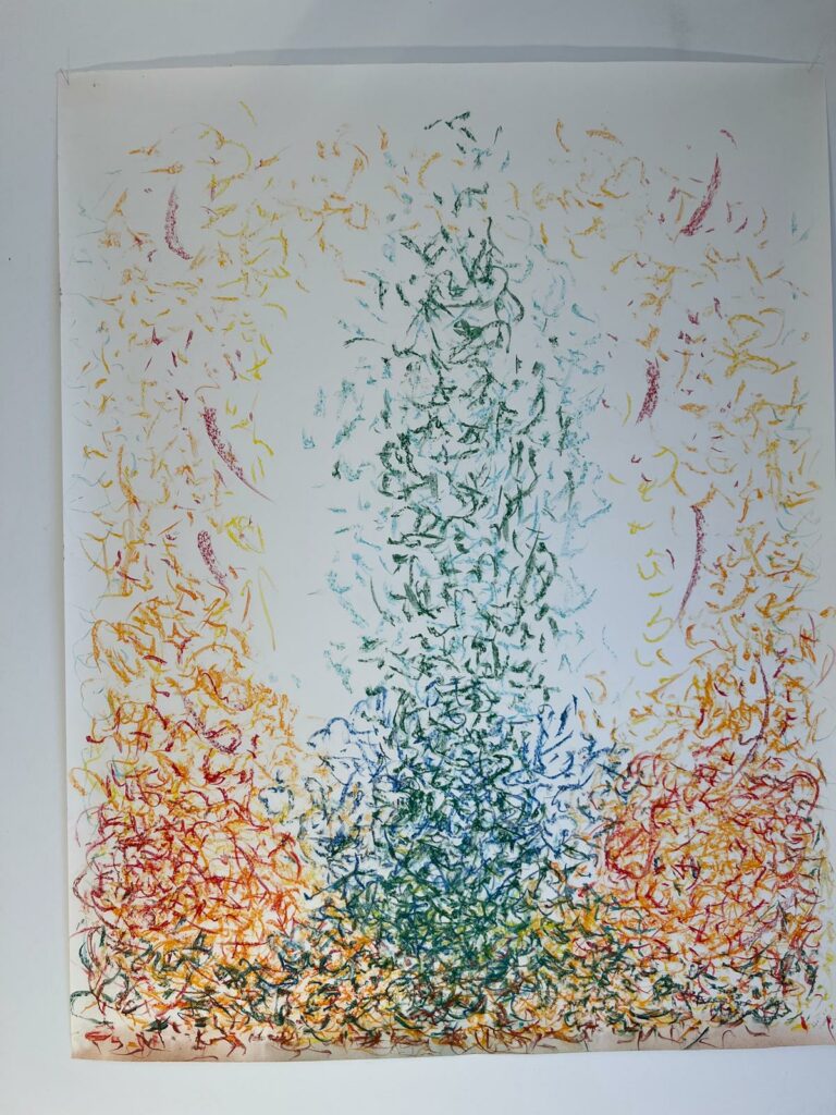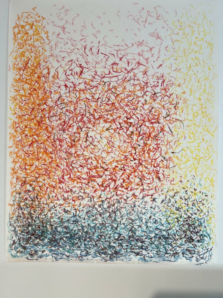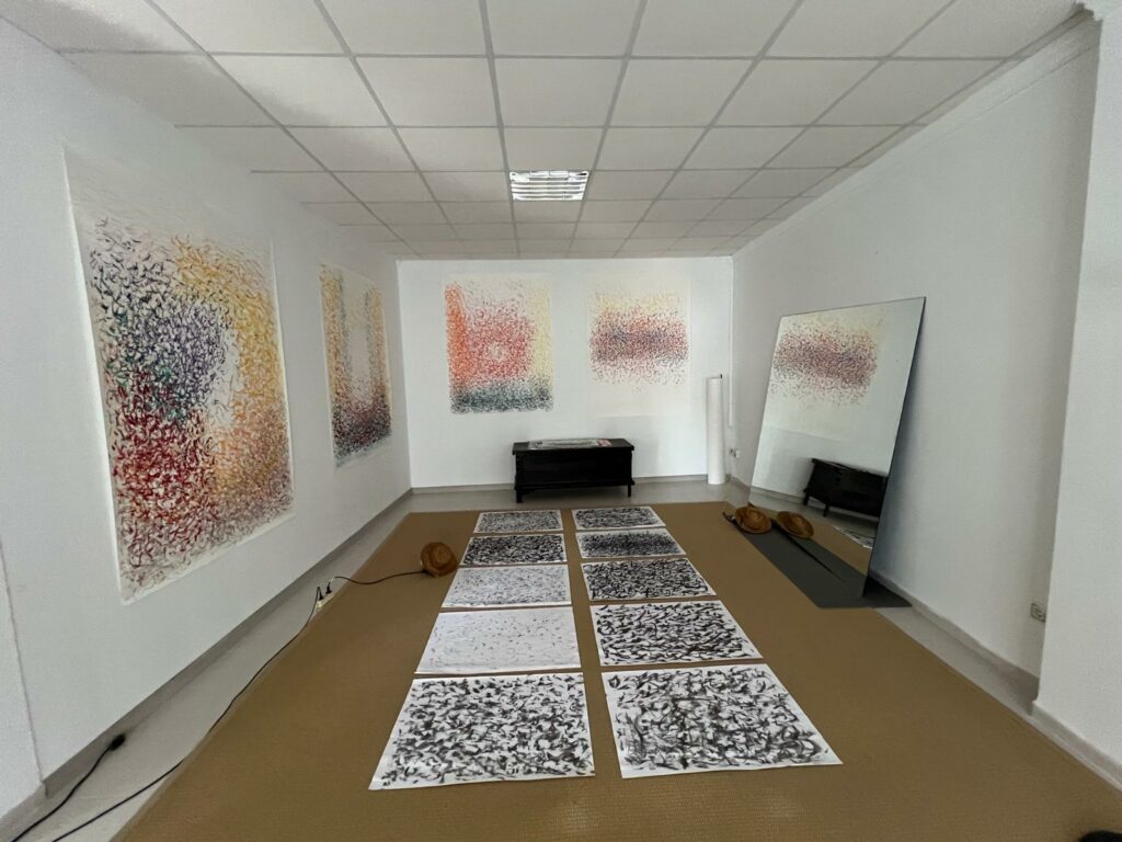 En resum, el llenç es converteix en un registre del moviment emocional de l’artista. És com si la música fos un corrent elèctric que fa moure el cos, i el contacte d’aquest cos amb la superfície pictòrica fos el que deixa l’empremta visual de l’energia i l’emoció viscudes en aquell instant.