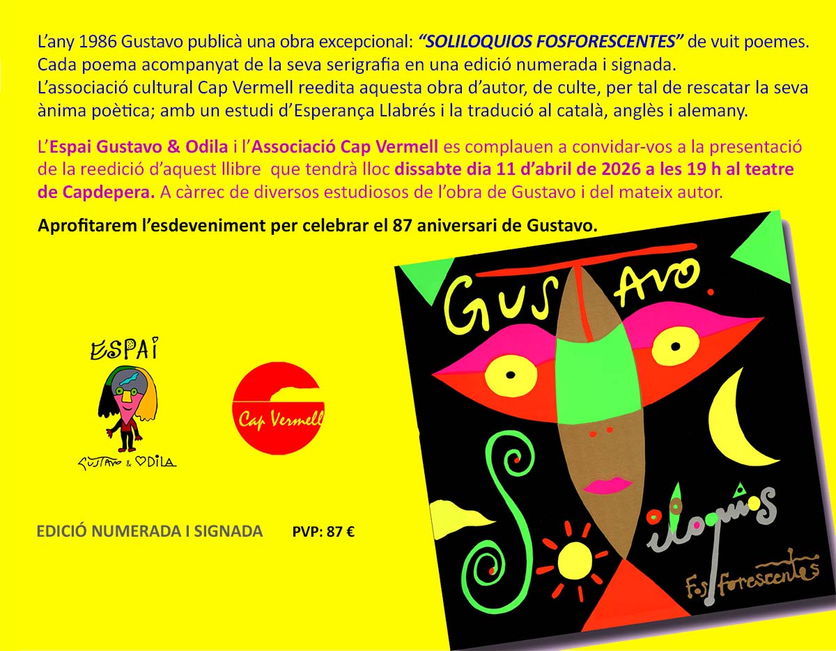 Dia 11 d’abril és l’aniversari de GUSTAVO. Compleix 87 anys. I aprofitam l’avinentesa per fer la presentació un llibre preciós: SOLILOQUIOS FOSFORESCENTES. Un llibre de nou poemes i vuit serigrafies, editat l’any 1986, i que ara en feim una edició signada i numerada de 400 exemplars a 87 € . Una reedició que vol rescatar l’ànima poètica de l’autor. Presentam aquest llibre amb versions al català, anglès i alemany; a banda del castellà original. Un llibre de col·leccionista, d’aquell temps en que Gustavo s’instala a Berlin, que treballa a la casa de cultura de Bethanien en que l’artista mostra la melangia cap a la seva terra amb uns colors que feren època. Els daurats, platejats i fosforescents. Amb un simbolisme exquisit i un lirisme punyent. Editat amb Documenta Balear i Imprempta LEO amb gran estima i cura extrema.