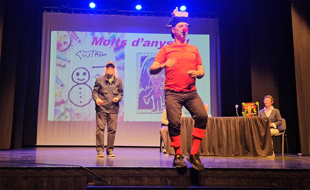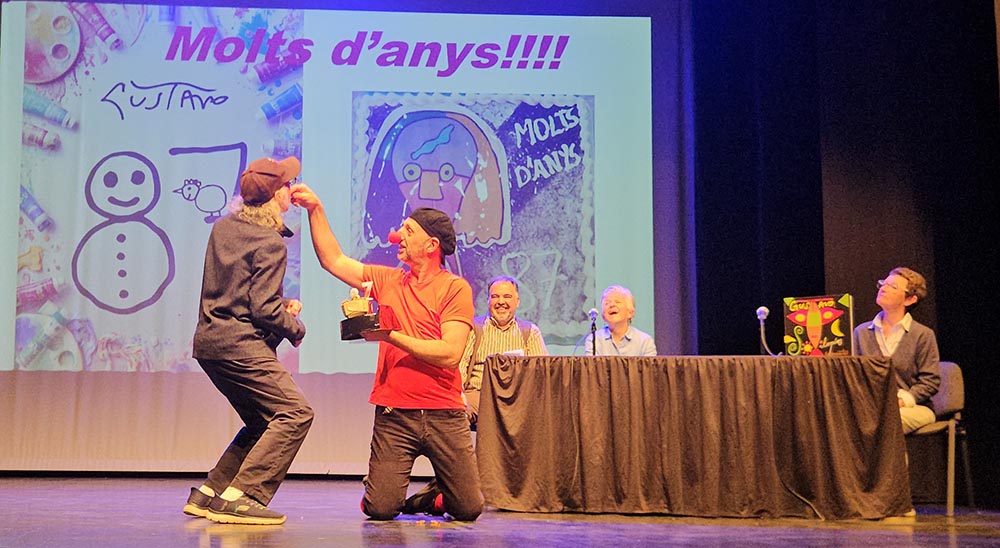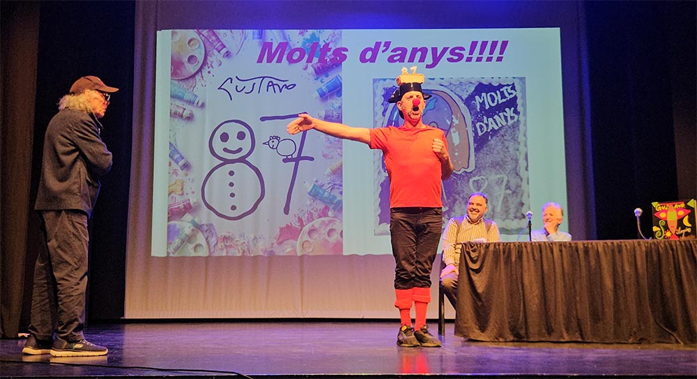 Toni Gomila, sortí a l’escenari al més pur estil de clown, nas vermell inclòs i amb un tricorni on duia una tortada de gató del Forn de sa plaça, on situà les espelmes que bufà GUSTAVO.