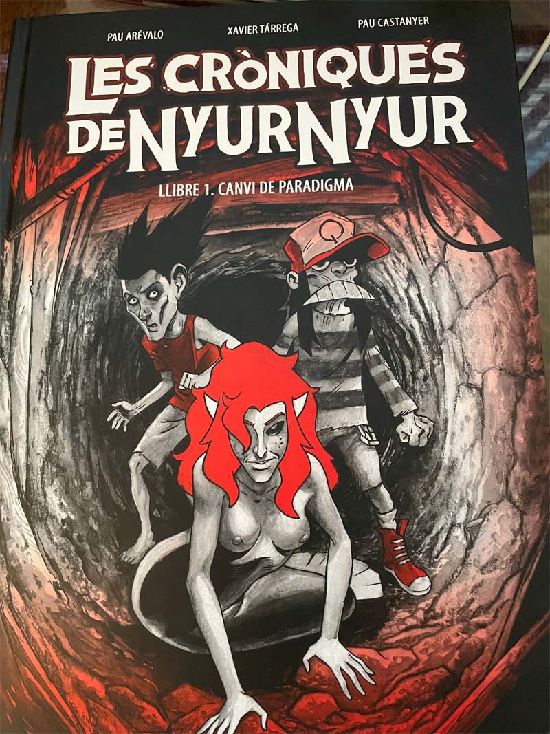 Primerament, vaig poder gaudir de la presentació que feu Pau Castanyer del Còmic “Cròniques de Nyur Nyur” acompanyat de l’autor Pau Arévalo en el Centre Cultural Cap Vermell, per tant ell jugava a casa. Aquesta vegada Castanyer se suma al projecte no només com editor, ans també com a coguionista, en una edició acurada d’aquesta trilogia que va ser presentada amb un atrezzo ple de caps de paper cartró i altres estris.