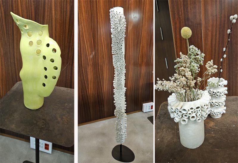 Entre la seva obra exposada destaquen les ceràmiques “Fa cinc anys que treball amb la ceràmica, amb gres que requereix altes temperatures. Tinc un forn i empr esmalts que no són industrials”. De formes molt originals (no usa el torn) amb esmalts tipus kudo mato, d’origen japonès, que es fa amb talc per donar una textura molt rugosa a les peces i un aspecte molt “natural”.
