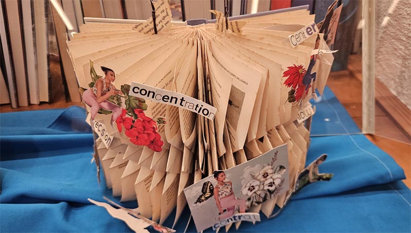 Sota el sugerent títol “La lletra per l’ull entra” mostra llibre d’artista, llibre alterat i poesia visual na Nena Mestre. La seva obra manifesta una desbordant imaginació amb la manipulació de llibres i imatges amb resultats sorprenents.
