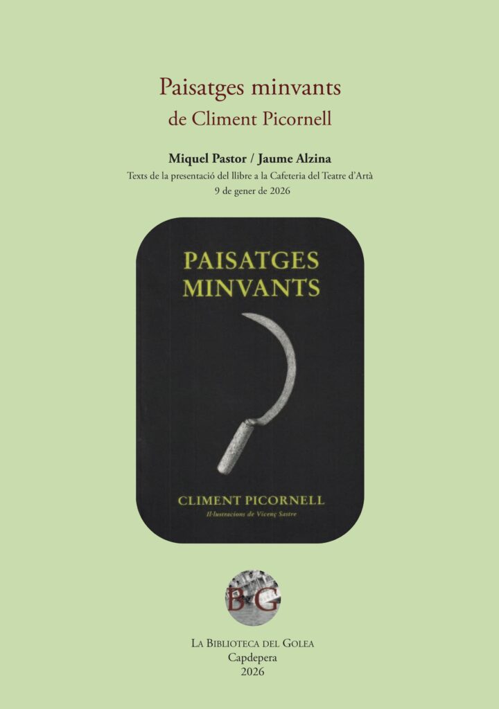 «El llibre que avui presentam (Paisatges Minvants) que tan acuradament ha escrit l’amic Climent Picornell m’ha fet recuperar una part de la meva ja quasi esvaïda memòria referent a algunes de les llunyanes vivències de la meva infantesa i joventut. Es tracta d’uns records, escenes i sensacions que malgrat el pas implacable del temps han perdurat en un racó gairebé amagat del meu enteniment i que van transcórrer al meu lloc de naixença, és a dir a Artà.» [Jaume Alzina]