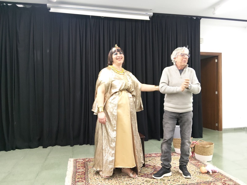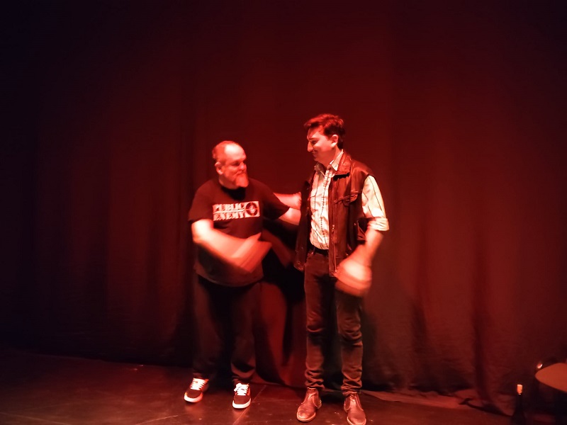 Seguidament, cada espectador tenia una entrada d’un color que li donava accés a una obra diferent. En primer lloc, l’entrada rosa et portava a les dues obres que es poden considerar comèdies, la màscara somrient del teatre, amb una primera peça Cleopatra, on es varen veure les dots creatives de Vernet, que ja ens té acostumats a presentar obres que a més de fer passar una estona divertida i entretinguda, tenen un caire més divulgatiu, amb les llicències i actualitzacions pròpies d’un bon director de teatre. L’actriu Raposo, encandilà el públic assistent amb una naturalitat interpretativa que anava més enllà de l’anecdotàri històric que presentava el personatge. D’altra banda, el següent as va ser per a Victòria amagada, del gabellí Arnau Serra, que jugava a casa, amb una divertida i atrevida posada en escena per part d’ambdós actors, amb demostració púbica i tot, la sortida de l’armari d’un dels seus protagonistes produïrà escenes còmiques que demostraren la valentia tant per part dels actors com del director per posar en relleu un tema com l’homosexualitat, portada a escena sense prejudicis i amb un llenguatge clar i sense complexes, amb bones dosis d’humor i també amb una naturalitat que romp els estereotips que sen’s ha venut respecte a aquest tema.