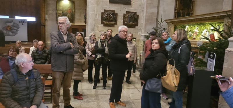 A l’església de Santa Creu ens esperava Mn. Bernat Nadal, qui va mostrar el betlem històric amb peces restaurades. A més de la visita al betlem, ens va fer un recorregut mostrant tots els elements artístics importants que hi ha a la Santa Creu. Destacà un exvot que representa la mateixa església i és un retrat (gairebé una crònica visual) de l’època en què es realitzà. Una visita molt interessant i didàctica.