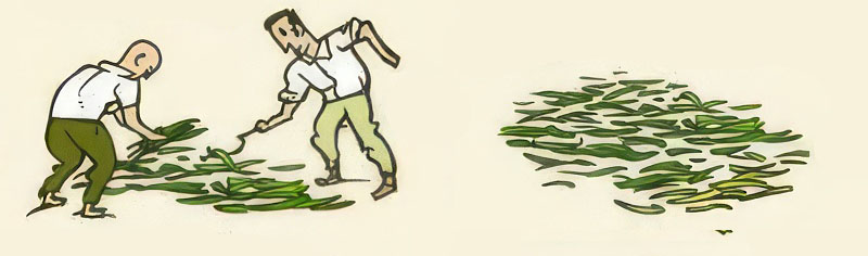 Estendre/assecar: Exposar les palmes al sol a fi que s’assequin i s’emblanqueixin. Es mantenen esteses de 15 a 20 dies i cada 6 o 7 dies es giren amb un falçó. Amb aquest procés les palmes minven entorn a un 55%.