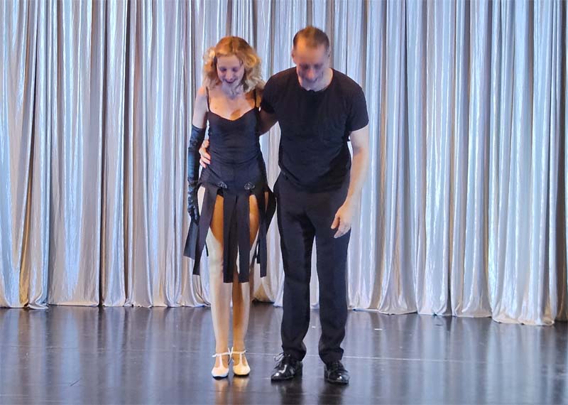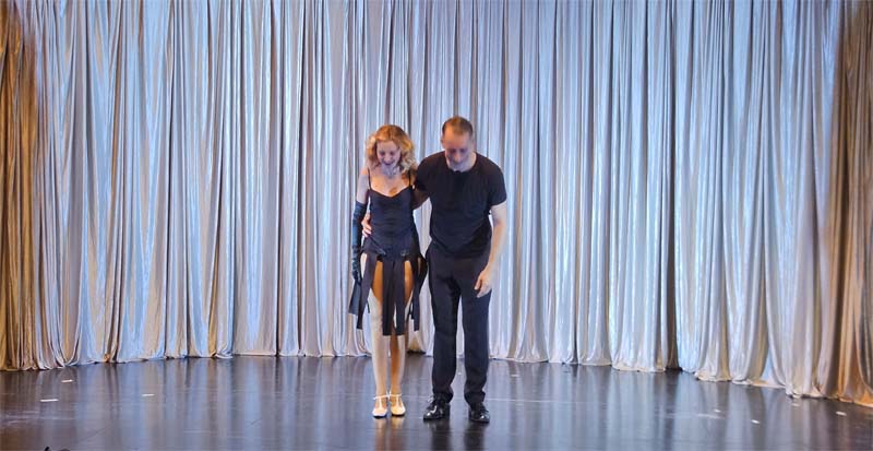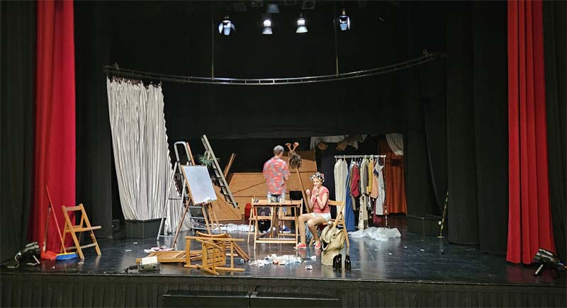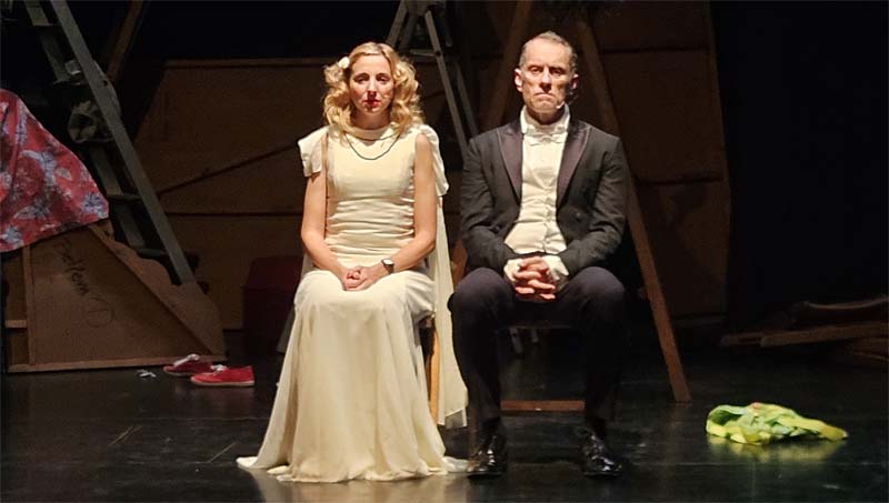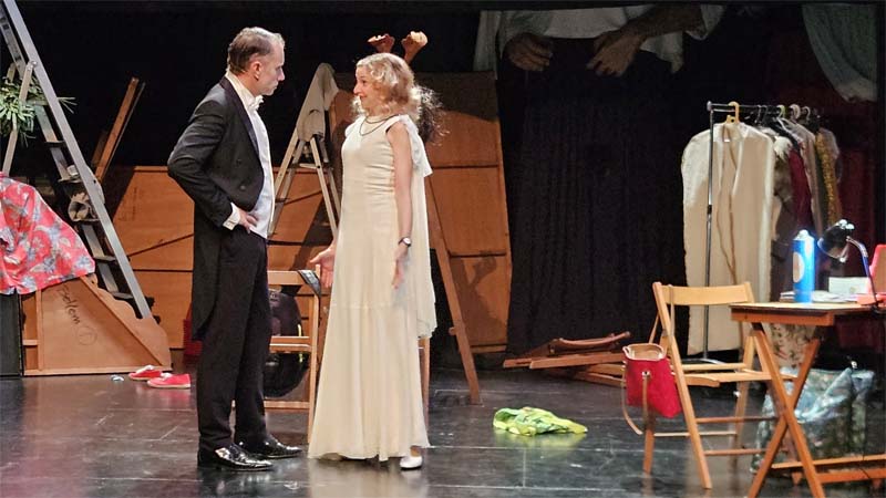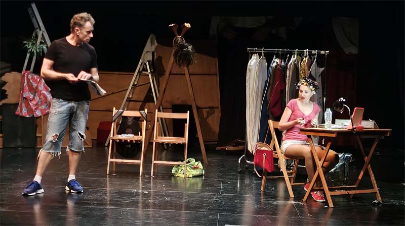 En primer lloc, s’ha de destacar la gran tasca interpretativa que realitzà l’elenc actoral, amb un ritme trepidant en els diàlegs i una compenetració notable. L’escenari estava format pels embalums del que hi ha rere les bambalines d’una obra de teatre. No és la primera obra que encamina els espectadors a veure el revés de l’escenari, on es desenvoluparà tota la trama argumental. Per mostra un botó: Noises off (1982) de Michael Frayn; The play that goes wrong (2012) de Mischief Theatre o Going on (1989) de Charles Dennis . Unes cortines, un munt de fems, vestuari per canviar-se, etc. Conformen l’atrezzo ideal per canviar-se de forma natural sobre l’escenari, aconseguint d’aquesta manera que el públic s’impliqui en la rutina quotidiana de dos actor, que són parella i que pateixen una crisi amorosa.