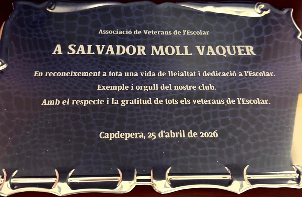 Primer va ser el C. D. Escolar i ara ha estat l’Associació de Veterans que va voler agrair a Salvador Moll Vaquer ser el soci de més edat i a qui van lliurar una placa commemorativa.